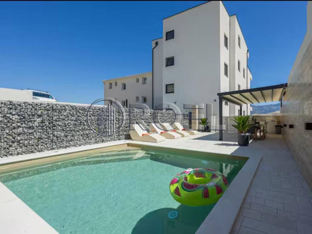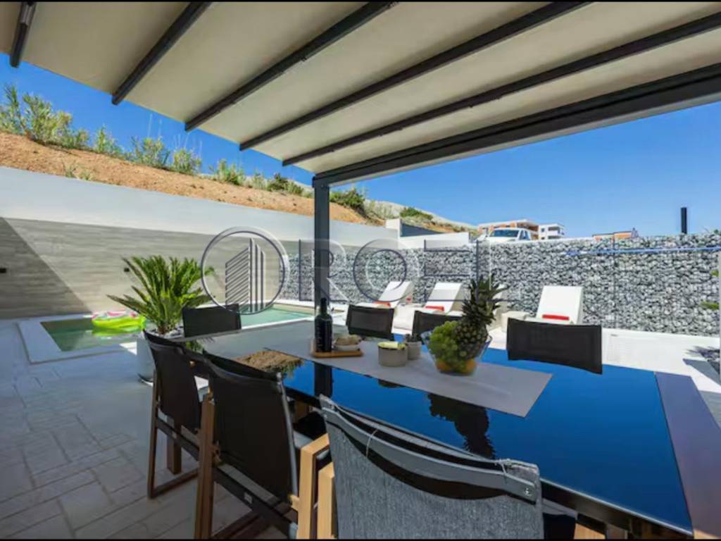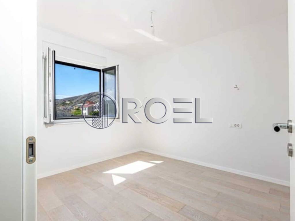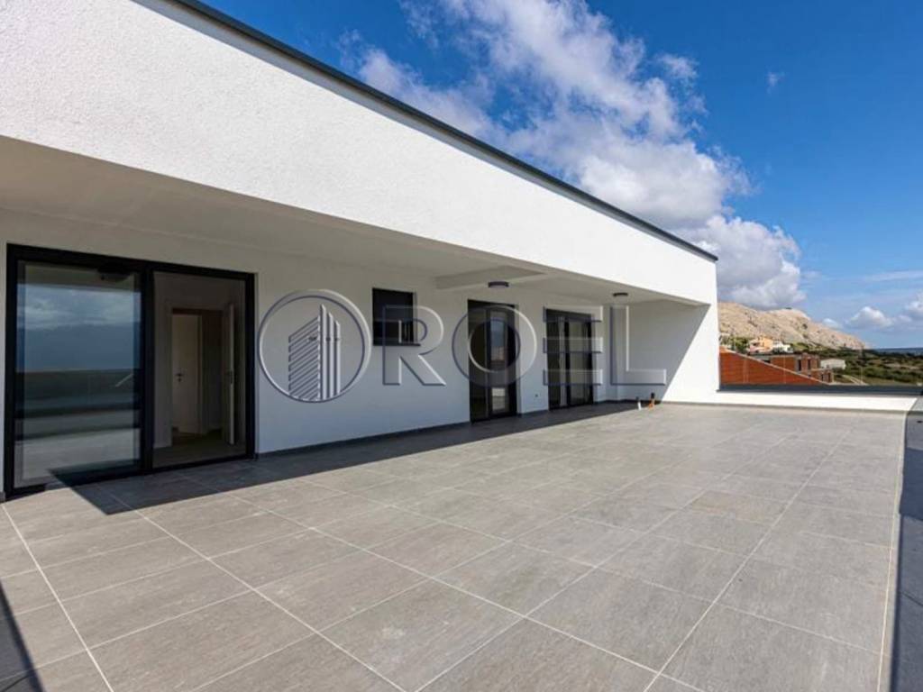 Trosobni penthouse nalazi se na drugom katu zgrade s bazenom u mirnoj ulici na Pagu, NKP 98.50 m2. Sastoji se kuhinje i blagovaone (22.05 m2), dnevnog boravka ( 15.65 m2), dvije spavaće sobe ( 11.65 m2 i 9.80 m2) i dvije kupaonice s wc-om ( 5.40 m2 i 5 m2). Stan dodatno krasi natkrivena terasa s pogledom na more veličine 28.40 m2 (14.20 m2), nenatkrivena terasa veličine 16.80 m2 ( 4.20 m2) i nenatkriveni balkon veličine 29.40 m2 (7.35 m2). Orijentiran je na istok, zapad i jug. Stanu pripada i vlastito nenatkriveno parkirno mjesto P2 veličine 12.80 m2 ( 3.20 m2). Stan je opremljen vrhunskim materijalima. Pod u stanu obložen je parketom i keramikom. Opremljen je pvc stolarijom ( iznutra bijela, izvana antracit), električnim roletama, video portafonom i klima uređajem. Zgrada ima ukupno pet apartmana i u dvorištu zgrade je i bazen koji je zajednički za stanare zgrade.Moguća zamjena za nekretninu u Zagrebu!