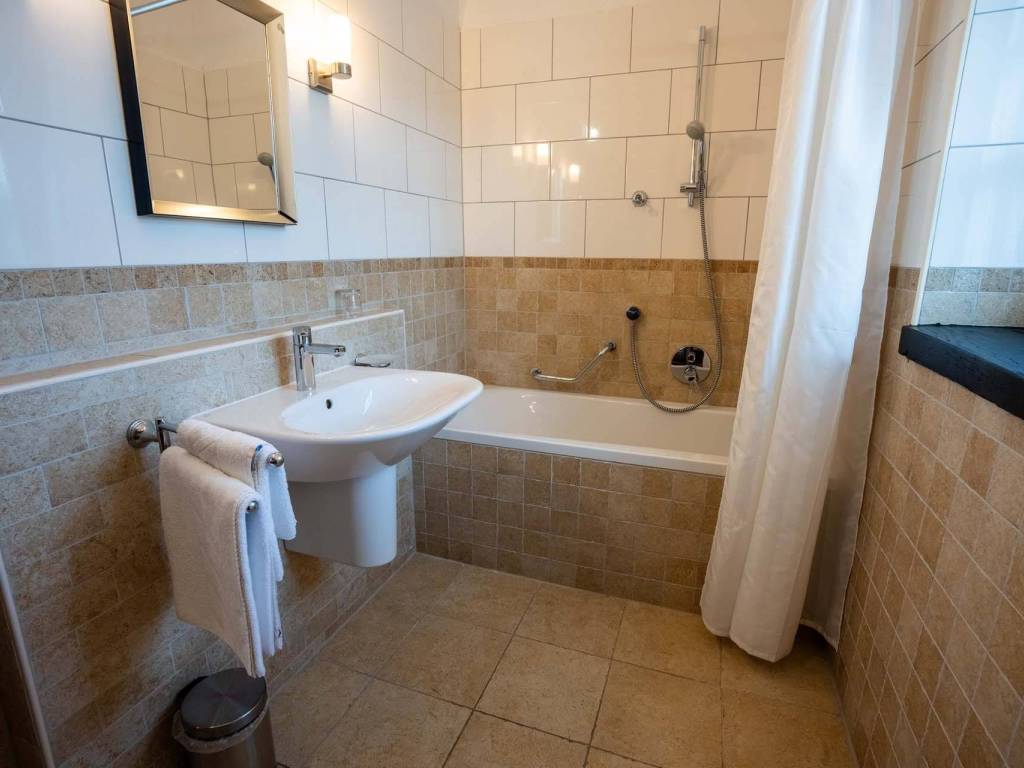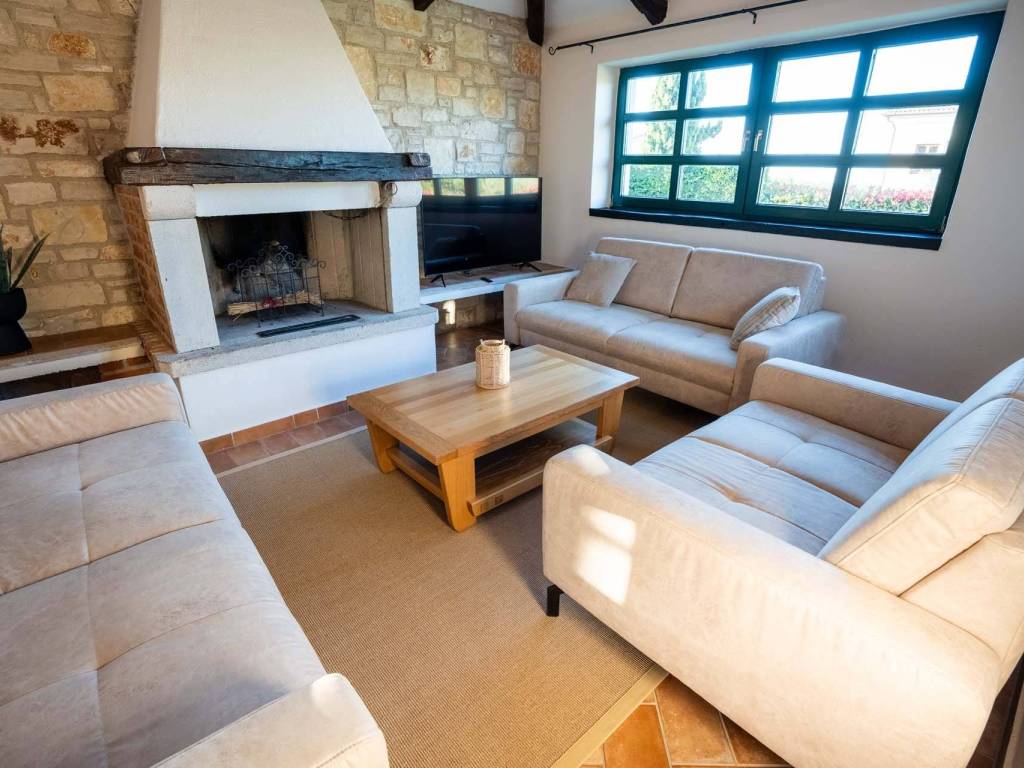 Das Wohnzimmer verfügt über einen gemauerten Kamin, der an kalten Wintertagen eine besondere Atmosphäre schafft.