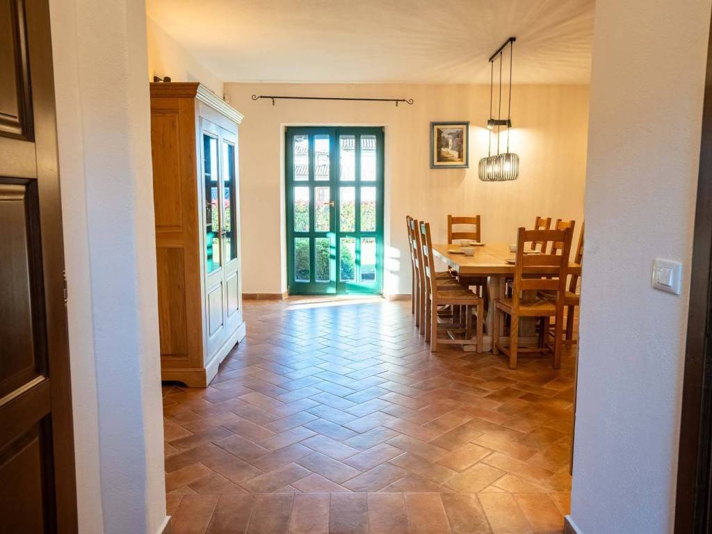 Die Küche ist komplett ausgestattet und das Esszimmer öffnet sich zu einer überdachten Terrasse mit Blick auf den Innenhof und den privaten Pool.