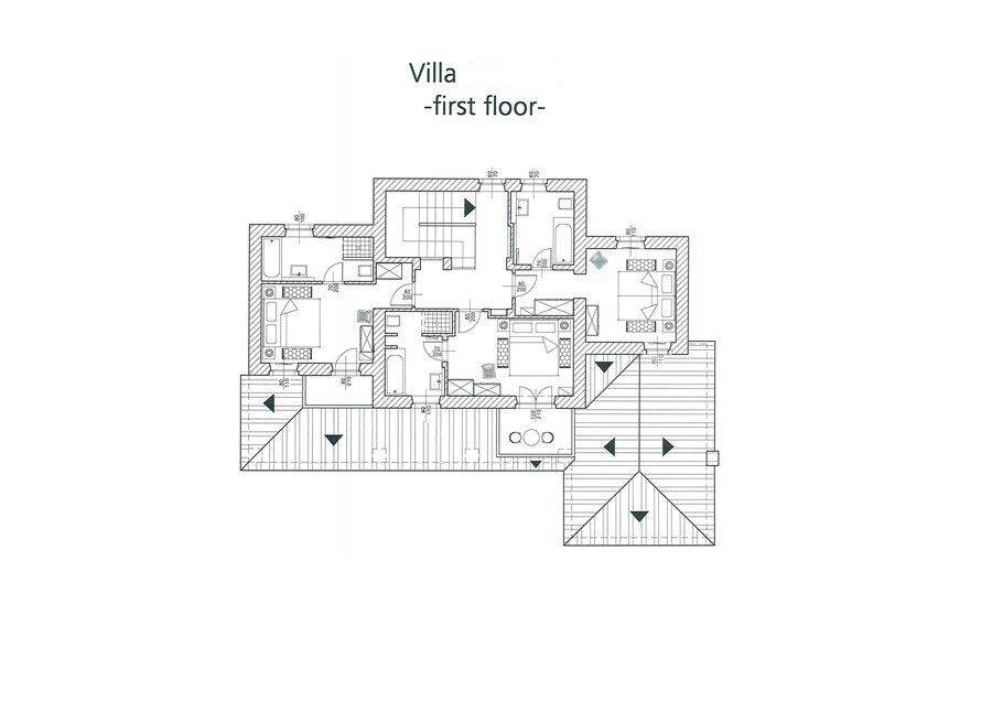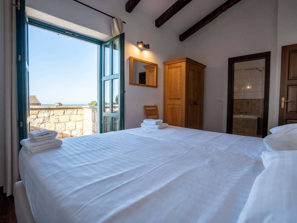 Im Erdgeschoss befindet sich ein Schlafzimmer mit eigenem Bad und Zugang zur Terrasse. Im ersten Stock befinden sich drei weitere Schlafzimmer, jeweils mit eigenem Bad. Zwei Zimmer verfügen zudem über einen privaten Balkon mit Meerblick.