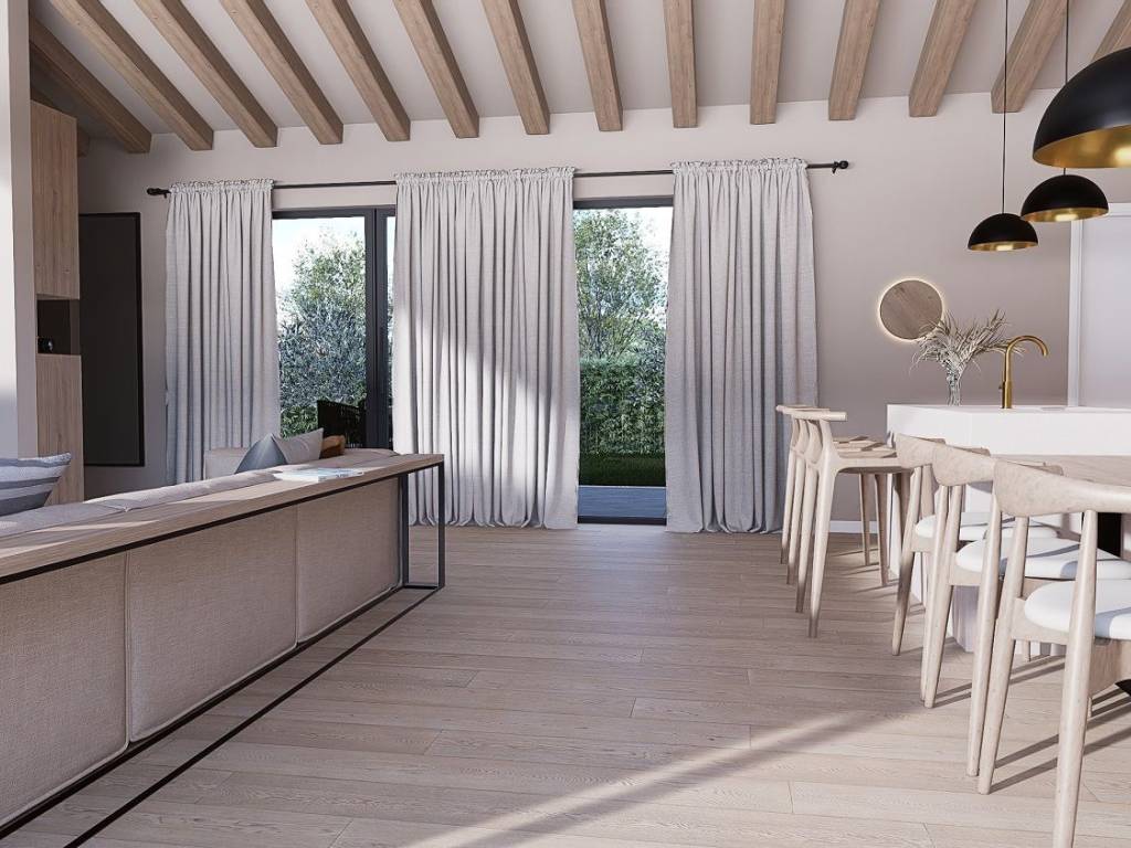 Die Villa verfügt über drei Schlafzimmer mit jeweils eigenem Bad sowie ein separates kleineres Badezimmer. Besonders hervorzuheben ist der großzügige und offene Wohn- und Essbereich mit Küche insgesamt über 60 m. Große Glasflächen sorgen für viel Tageslicht, und der Blick in die Natur ist von allen Seiten ein Genuss.
