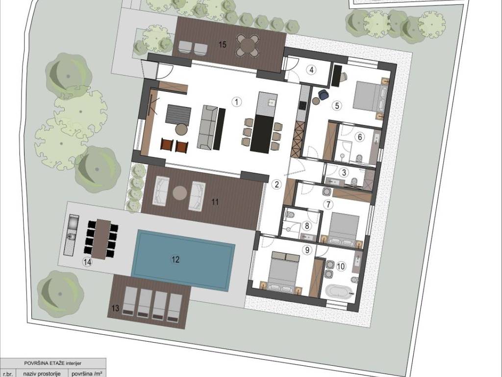 Poreč, 3 km eine einstöckige Villa auf einem 750 m großen Grundstück. Der Innenbereich erstreckt sich über 150 m, dazu kommen 95 m Außenfläche mit Swimmingpool, Sonnenterrasse, Loungebereich und Außenküche.