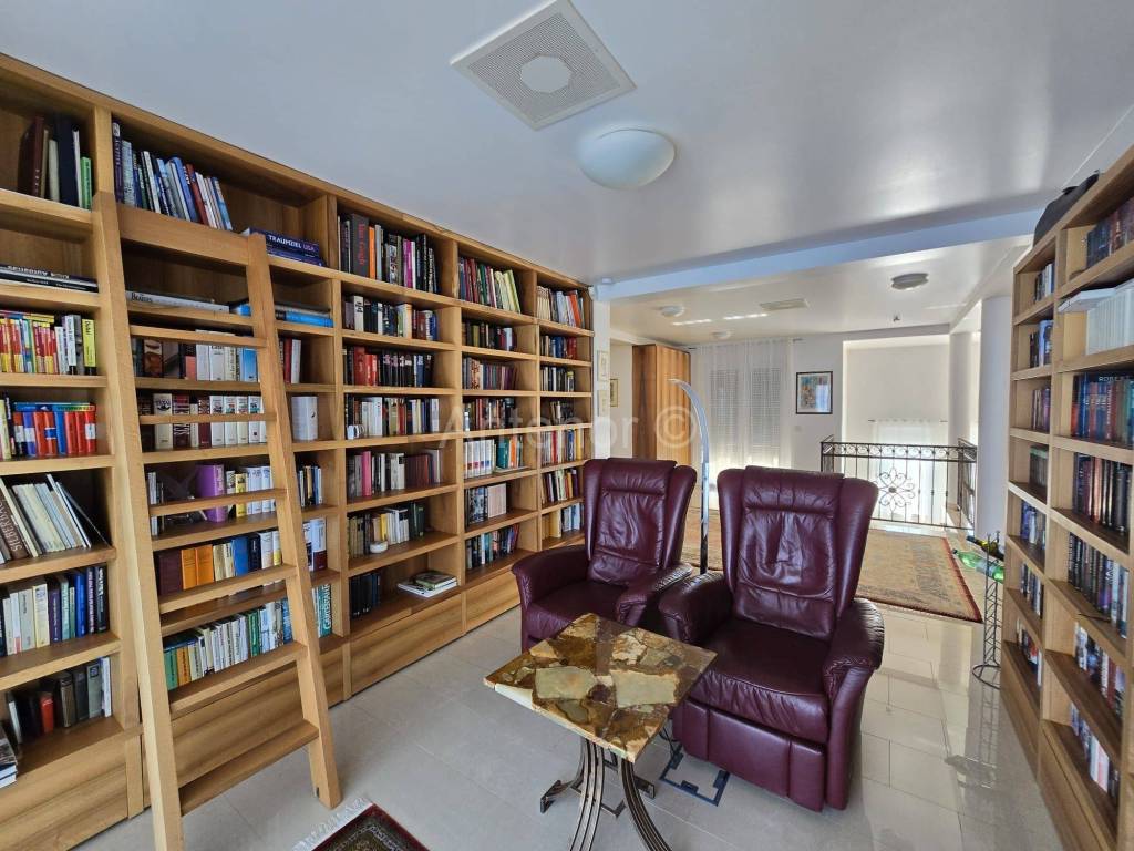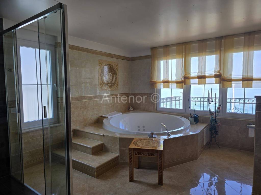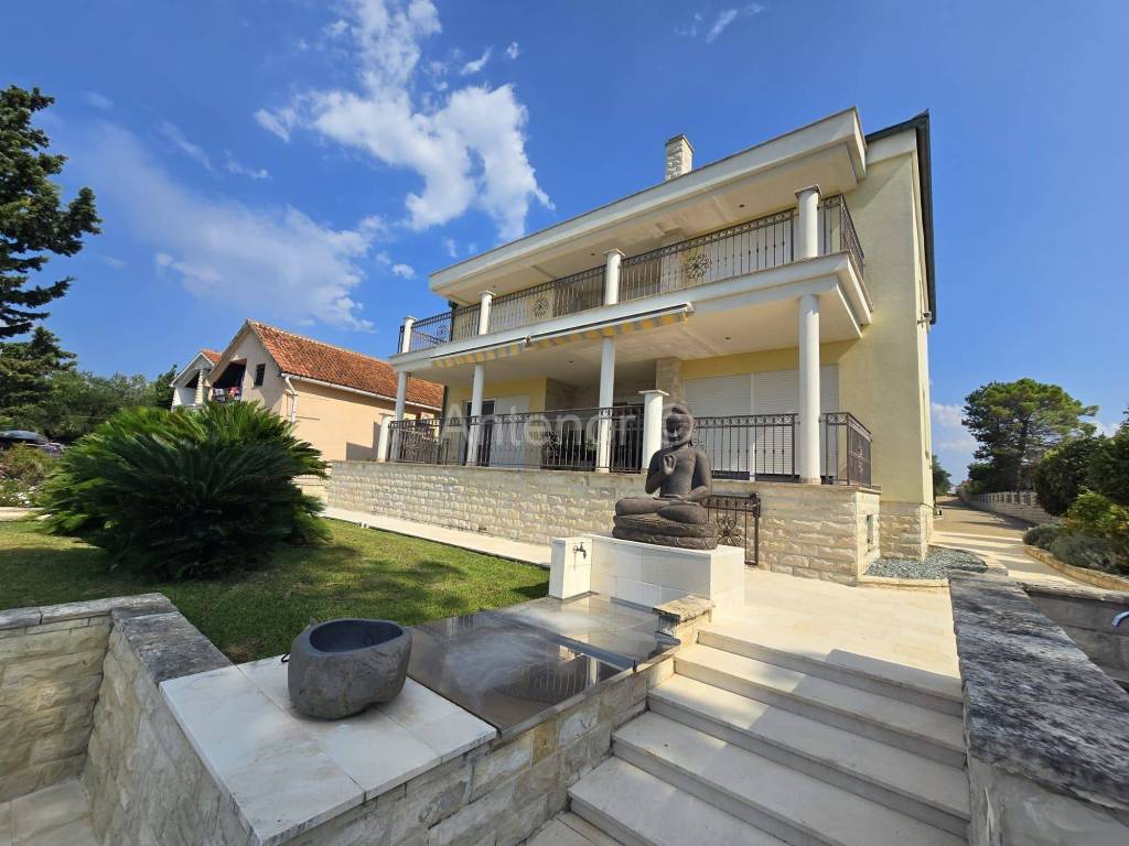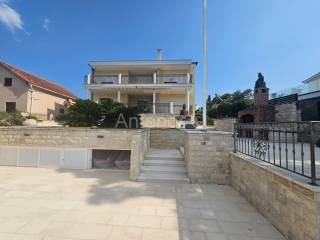 ZUKVE - VRSI - U 1. redu do mora nalazi se vila od tri etaže (podrum, prizemlje i 1. kat). U podrumu se nalazi konoba sa kaminom i stolom za druženje, soba za rekreaciju sa spravama za teretanu, kotlovnica, uređena vinoteka sa vratima izgrađenim po mjeri te 4 spremišta. Prizemlje se sastoji od natkrivenog ulaza, hodnika, radne sobe, kupaonice, kuhinje, dnevnog boravka i blagavaone, ostave i terase. Unutarnjim stubištem se dolazi do 1. kata gdje nalaze hodnik, dvije spavaće sobe, čitaonica, praonica, wc, 3 natkrivena balkona, te wellness prostorija sa saunom, jacuzzijem i kupaonicom. Tlocrtna površina veće kuće je oko 448,90 m2.