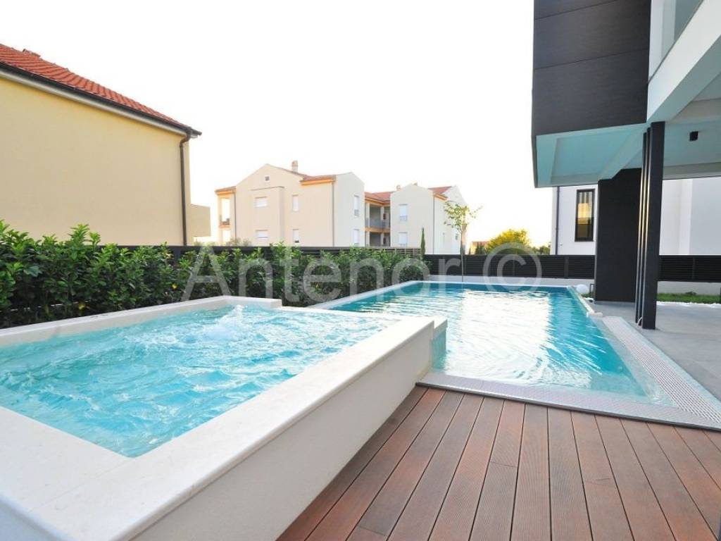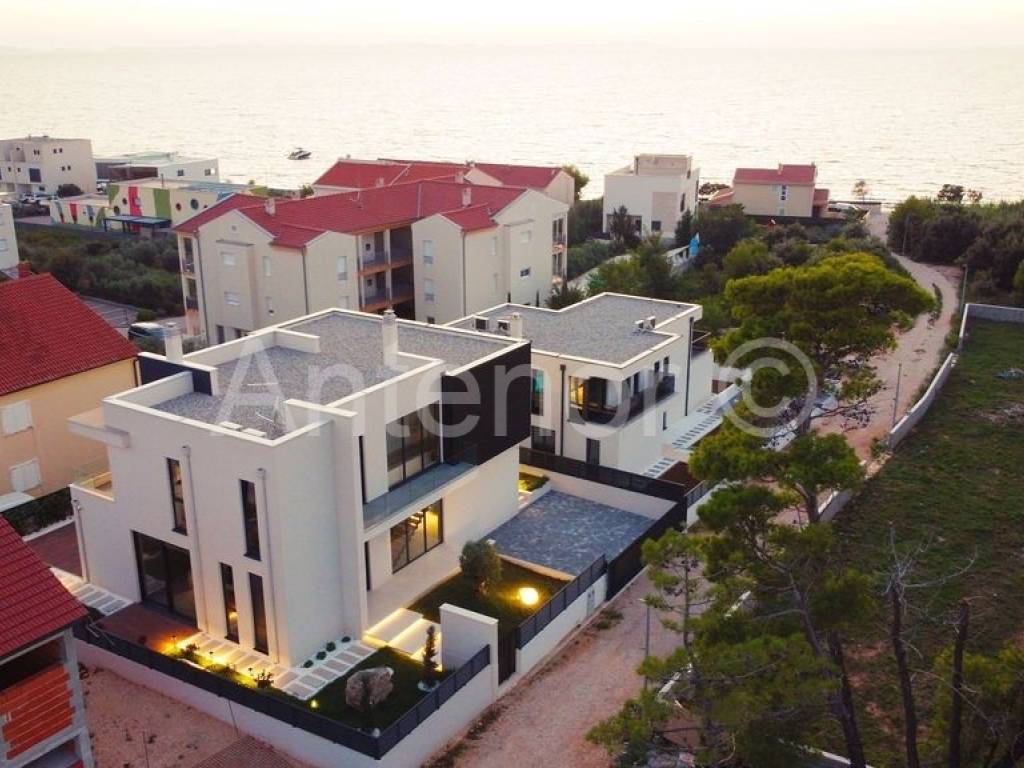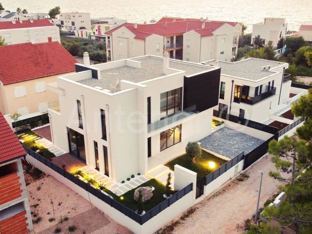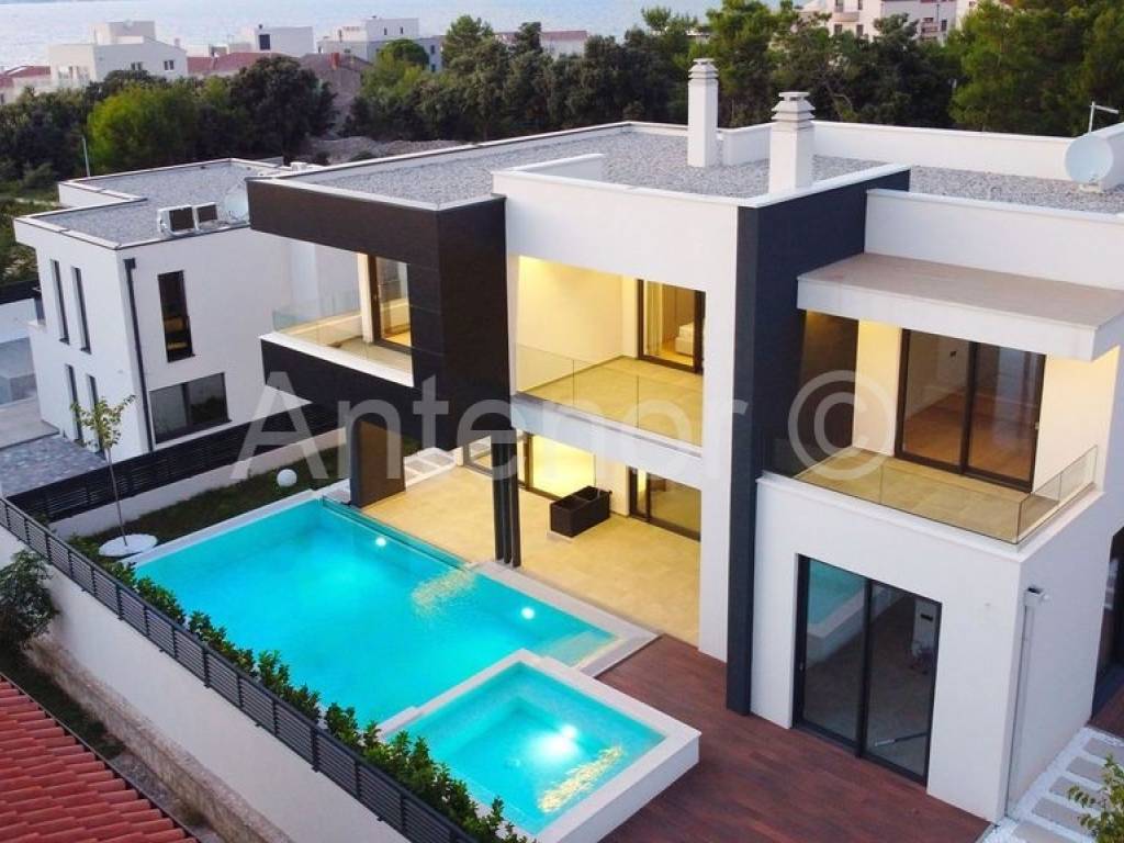 PRIVLAKA - vila sa bazenom, novogradnja.Kuća je smještena u mirnom dijelu mjesta Privlaka, 120 m do mora. Kuća je kompletno opremljena, a sastoji se od prizemlja i kata, vanjskih tlocrtnih dimenzija 15.80 x 12.40 metara. U prizemlju kuće nalazi se hodnik, kupaona, sauna, ostava, jedna spavaća soba, kuhinja s blagovaonicom, dnevni boravak i terasa. Unutarnjim stepenicama dolazi se na kat gdje se nalazi hodnik, spavaća soba s kupaonicom i garderobom, te još dodatne dvije spavaće sobe svaka sa svojom kupaonicom i terasa koja je dijelom natkrivena, a dijelom ne natkrivena. Okućnica kuće je uređena s autohtonom holtikulturom i bazenom sa jacuzzijem od ukupno 43 m2.