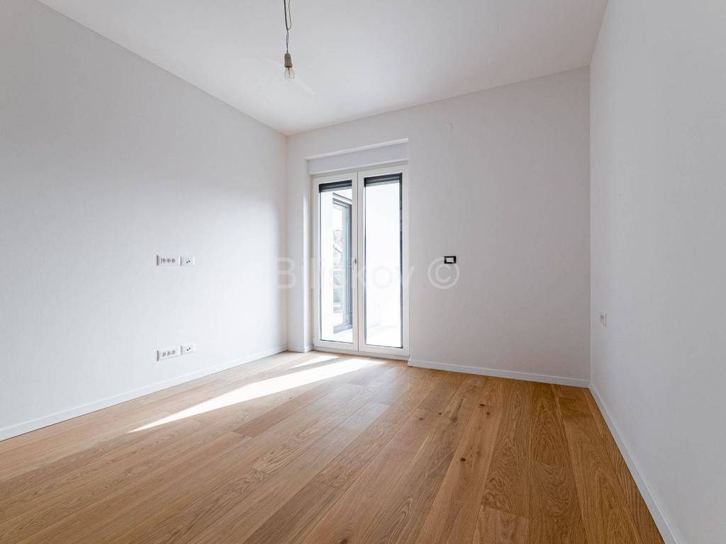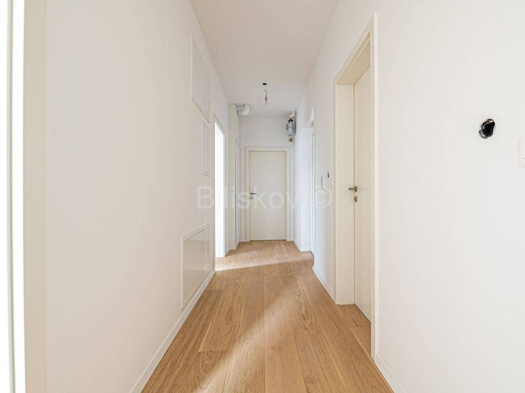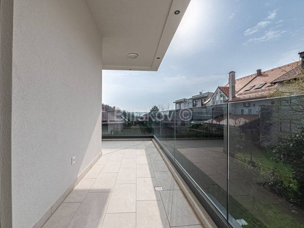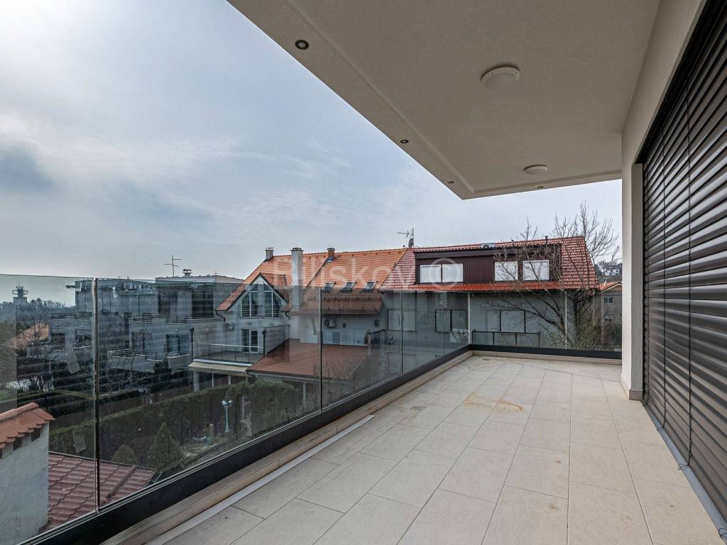 Die zweite Wohneinheit befindet sich im ersten Stock und besteht aus einem Flur, Wohnzimmer mit Küche und Esszimmer mit Zugang zu einem großen Balkon, zwei Badezimmern, drei Schlafzimmern, von denen eines Zugang zu einem großen Balkon hat, während das andere über einen verfügt separater kleiner Balkon. Die Gesamtfläche beträgt 101 m2.