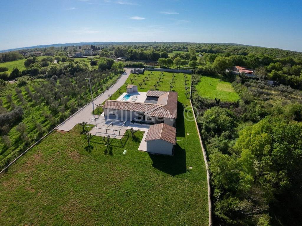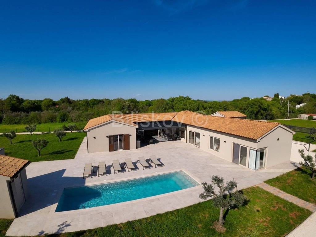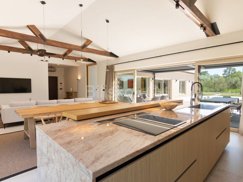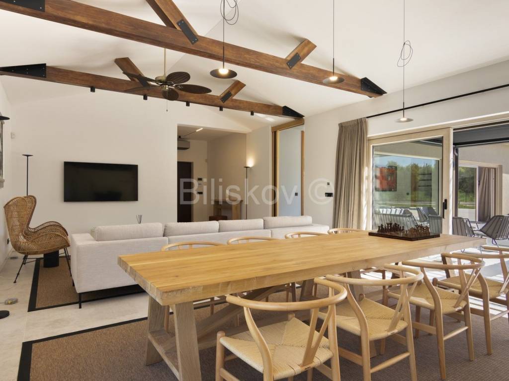 Luxuriöse und mit Design ausgestattete freistehende Villa mit einer Bruttofläche von 400 m2 (netto 280 m2) gebaut im Jahr 2022 auf einem Grundstück von 5.764 m2 mit einem wunderschön angelegten Garten, Swimmingpool, Fitnessraum, Sauna und überdachtem Parkplatz.