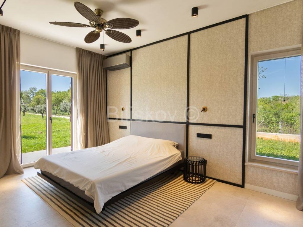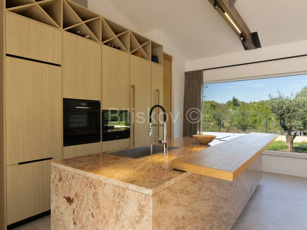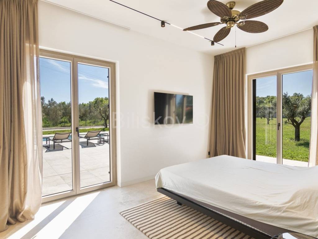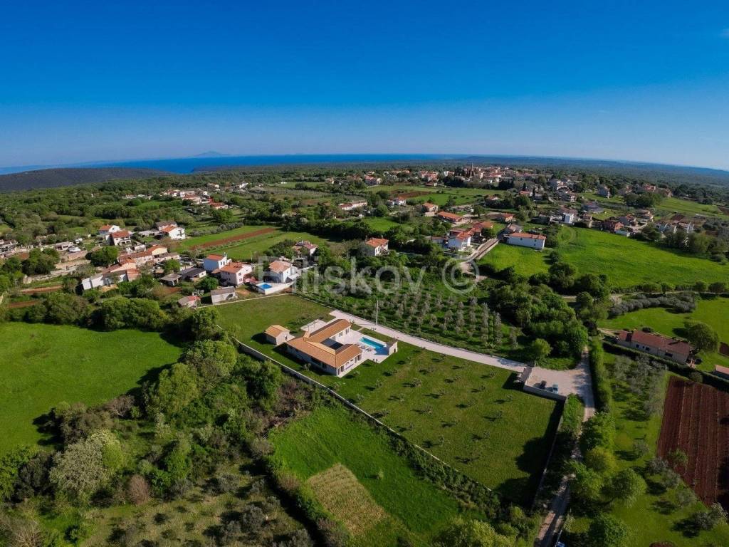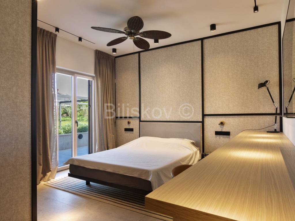 Luxuriöse und mit Design ausgestattete freistehende Villa mit einer Bruttofläche von 400 m2 (netto 280 m2) gebaut im Jahr 2022 auf einem Grundstück von 5.764 m2 mit einem wunderschön angelegten Garten, Swimmingpool, Fitnessraum, Sauna und überdachtem Parkplatz.