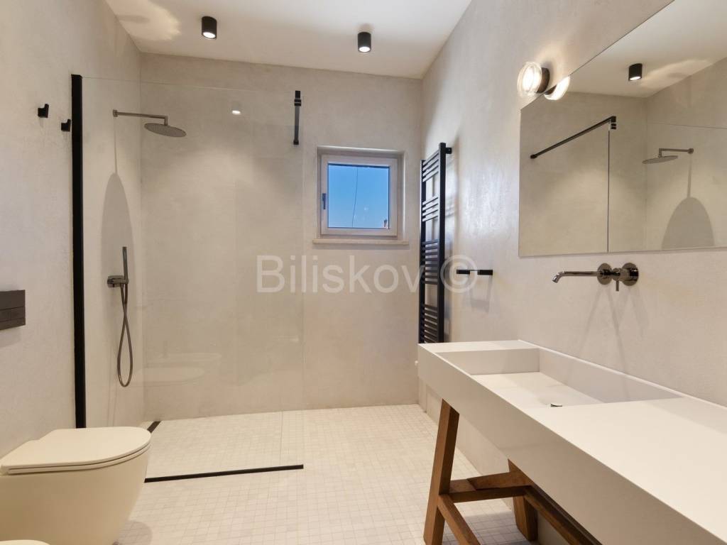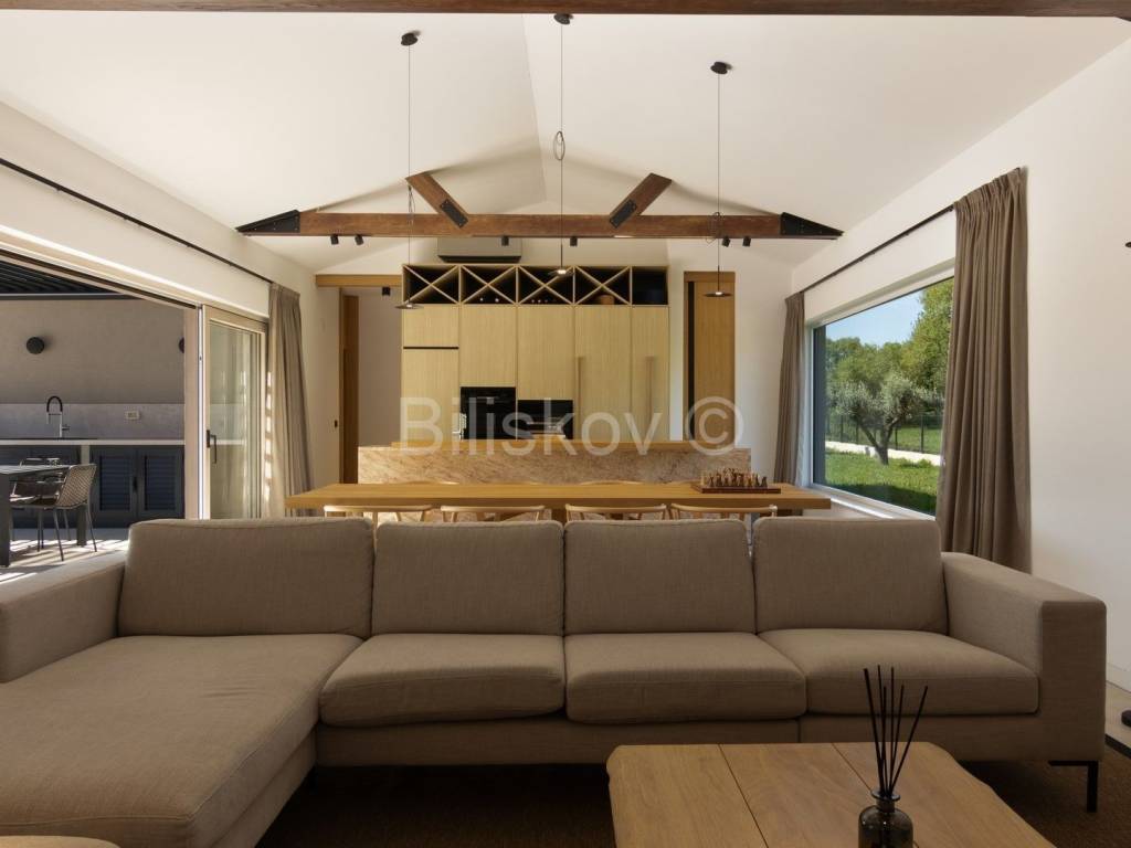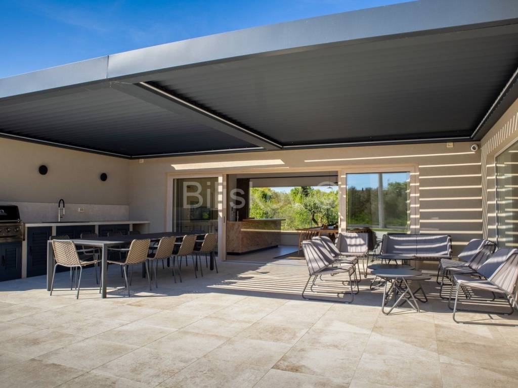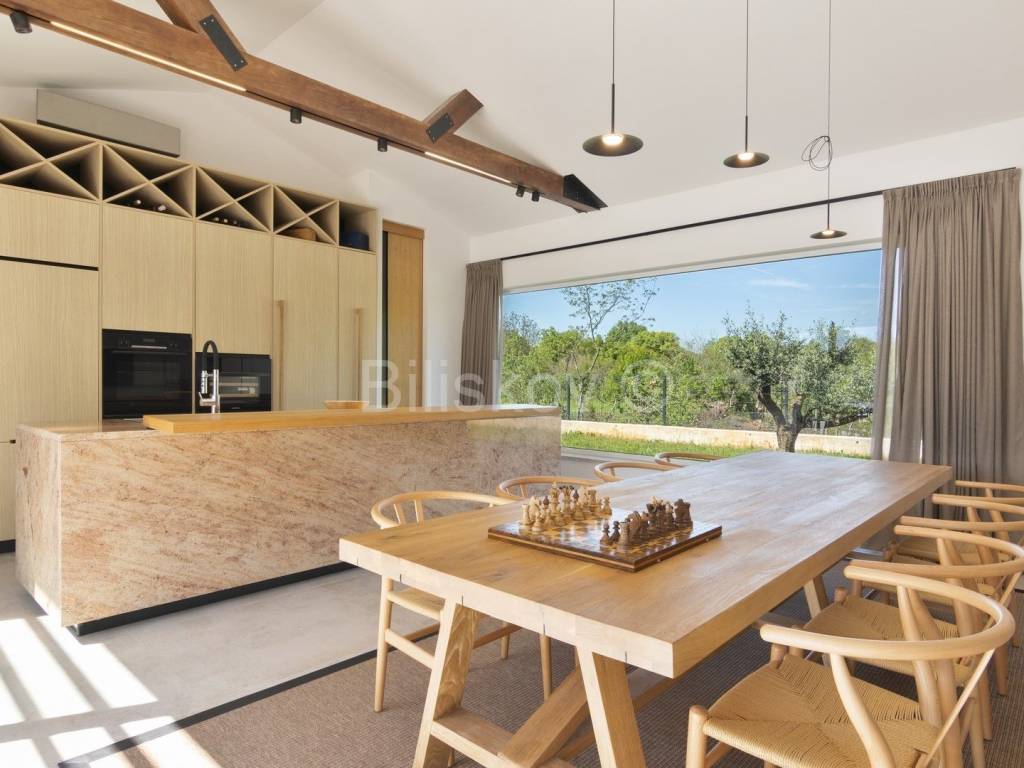 Auf der Rückseite des Hauses befindet sich eine geräumige Terrasse mit Grill, einem Swimmingpool und einem Esstisch mit Sitzgelegenheiten, auf der Sie sich entspannen und die schöne Landschaft oder die Morgensonne genießen können. Die Designer-Badezimmer verfügen über eine ebenerdige Dusche mit Glaswand. Die Villa verfügt über Fußbodenheizung und Wärmepumpe, Klimaanlage, hochwertige Aluminium-/PVC-Tischlerei, Videoüberwachung und einen Alarm.