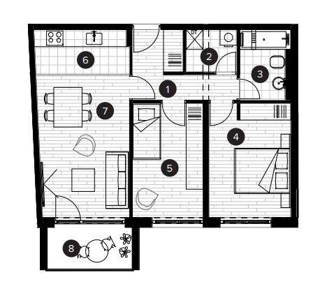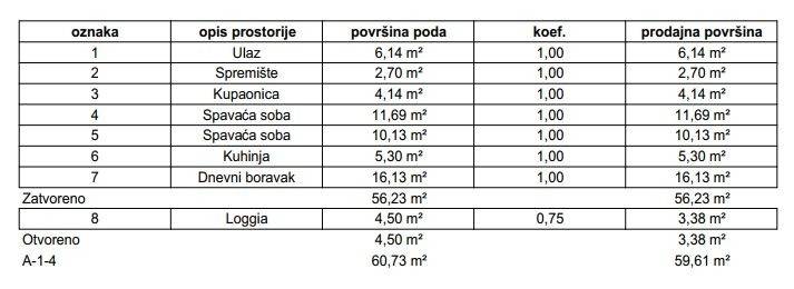 Stan će se nalaziti na prvom katu zgrade, ukupne prodajne površine 59,61 m (ukupna neto površina poda iznosi 60,73 m), a sastoji se od ulaznog prostora, open space dnevnog boravka s blagovaonicom i kuhinjom, dvije spavaće sobe, kupaonice, loggie i spremišta.