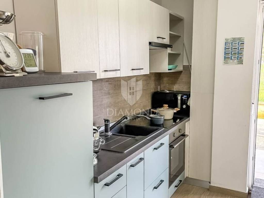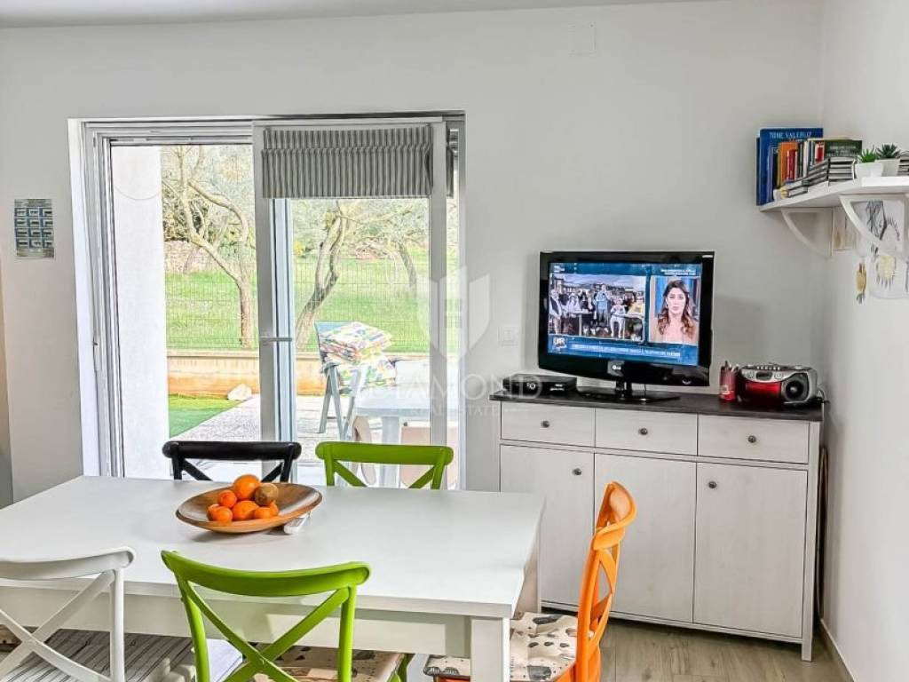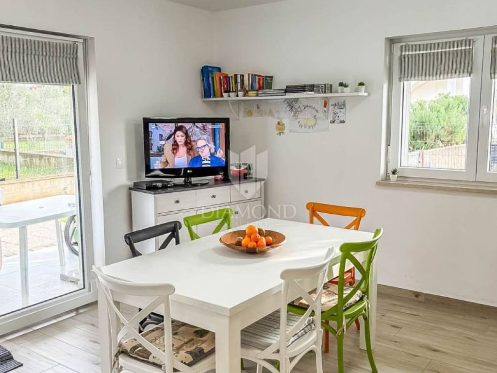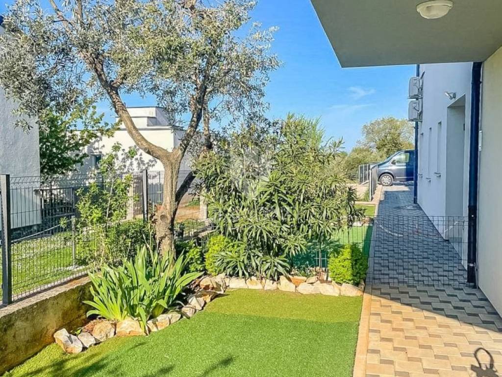 Zum Verkauf steht eine moderne Erdgeschosswohnung in einem hochwertigen Wohngebäude aus dem Jahr 2020. Die Wohnung bietet 64,91 m² Wohnfläche sowie 100 m² Eigengarten – ideal für das Leben im Freien mit maximaler Privatsphäre. Die Raumaufteilung umfasst Vorraum, ein tagesbelichtetes Bad, Küche mit Essbereich, Wohnzimmer und Schlafzimmer. Die Einheit ist hell, funktional und ästhetisch ansprechend. Sie wird komplett möbliert und bezugsfertig übergeben. Weitere Merkmale: privater Stellplatz, PVC-Fenster, Klimaanlage zum Kühlen und Heizen sowie ein moderner Innenausbau mit dem Frischegefühl eines Neubaus. Der zum Eigentum gehörende Garten ist ein großer Pluspunkt, von einem Olivenhain umgeben – perfekt für Familien, Haustiere oder als Bereich zum Entspannen und für gesellige Runden.