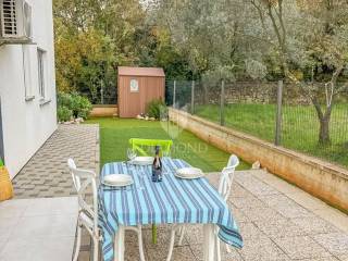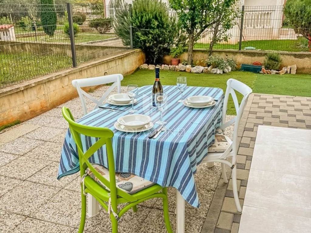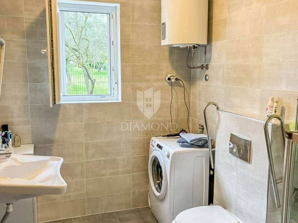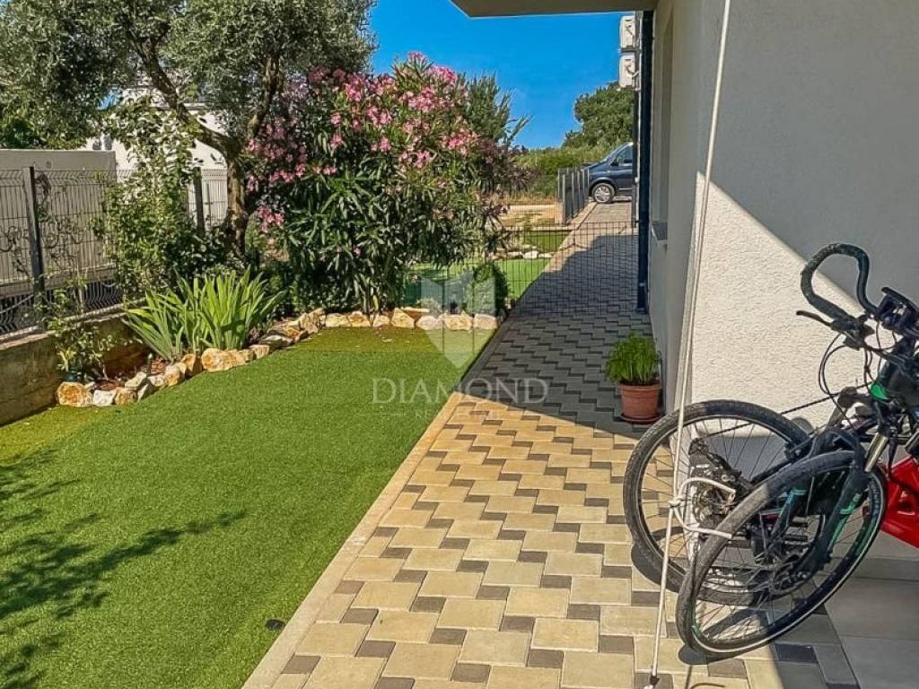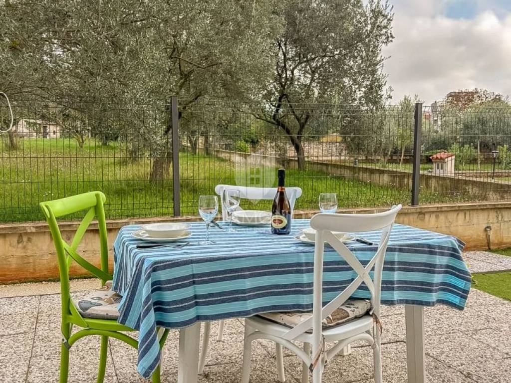 Zum Verkauf steht eine moderne Erdgeschosswohnung in einem hochwertigen Wohngebäude aus dem Jahr 2020. Die Wohnung bietet 64,91 m² Wohnfläche sowie 100 m² Eigengarten – ideal für das Leben im Freien mit maximaler Privatsphäre. Die Raumaufteilung umfasst Vorraum, ein tagesbelichtetes Bad, Küche mit Essbereich, Wohnzimmer und Schlafzimmer. Die Einheit ist hell, funktional und ästhetisch ansprechend. Sie wird komplett möbliert und bezugsfertig übergeben. Weitere Merkmale: privater Stellplatz, PVC-Fenster, Klimaanlage zum Kühlen und Heizen sowie ein moderner Innenausbau mit dem Frischegefühl eines Neubaus. Der zum Eigentum gehörende Garten ist ein großer Pluspunkt, von einem Olivenhain umgeben – perfekt für Familien, Haustiere oder als Bereich zum Entspannen und für gesellige Runden.
