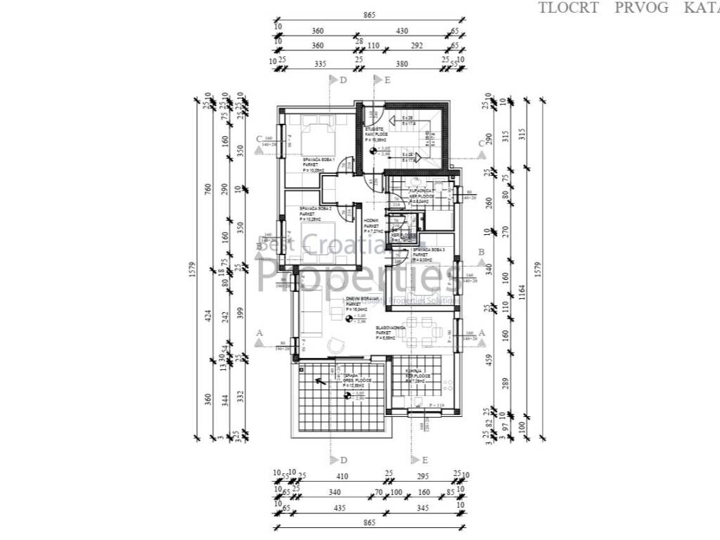 Konstrukcija i materijali: Objekt se gradi na armiranobetonskim temeljima, sa zidovima od opeke debljine 25 cm i punim AB pločama. Pregradni zidovi su izvedeni od šuplje opeke debljine 10 cm, ožbukani i ličeni bojama po izboru investitora. Vanjski zidovi obloženi su ETICS termofasadom sa završnim slojem silikatne žbuke. Ugradit će se PVC stolarija s IZO staklom, vanjski zastori bit će žaluzine, a unutarnja stolarija drvena, furnirana. Podovi se oblažu keramikom ili parketnim daščicama, dok su sanitarni prostori i kuhinja u potpunosti obloženi keramičkim pločicama. Terase će biti popločane protukliznim pločicama, a sustav odvodnje riješen pocinčanim limom.