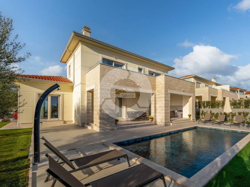 A beautiful villa with an authentic look, located in a quiet location in a small Istrian town, not far from the sea (1 km). With its elegance and architecture, it exudes a bit of Venetian style. It was built in 2022. It consists of two floors: ground floor and first floor. On the ground floor there is a hallway, toilet, storage room, spacious living area (dining room, kitchen and living room), and one bedroom with a private bathroom. The living area leads to a large covered terrace, summer kitchen, swimming pool and garden. On the first floor there are two more bedrooms, each with its own bathroom, and a balcony with a panoramic view of the sea. The heating is underfloor, and the heating/cooling is regulated by air conditioning units, while hot water is obtained via solar panels. The yard is fenced, part of the garden is decorated with Mediterranean plants and lawn, and the other part is designed for 2 parking spaces. There is also a 28 m2 heated swimming pool in the garden. The villa, with its high ceilings and furnishings, as well as other interior and exterior details, gives a touch of luxury. Therefore, it is an excellent choice for those looking for an authentic property near the sea for themselves, or as an investment for tourist rental.