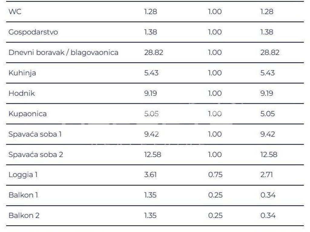 Prostrani trosobni stan sastoji se od dvije spavaće sobe, kupaonice, wc-a, ostave, hodnika, dnevnog boravka s kuhinjom i blagovaonicom, loggie i 2 balkona.