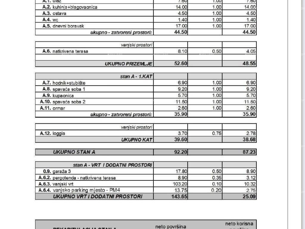 Verkauf von modernen Wohnungen in einem Neubau, RovinjWOHNUNG A, Gebäude B1Eine Maisonette-Dreizimmerwohnung mit Süd-West-Ausrichtung, gelegen an einem schönen Standort, nur 2 Kilometer vom Zentrum Rovinjs entfernt.Das Erdgeschoss besteht aus einem Eingangsbereich, einem WC, einem Abstellraum, einer Küche mit Essbereich und einem Wohnzimmer mit interner Treppe.Im ersten Stock befinden sich zwei Schlafzimmer, ein Kleiderschrank, ein Badezimmer und eine Loggia.Die Außenbereiche umfassen eine überdachte Terrasse, eine Terrasse mit Pergola-Markise (3,12 m²) und einen Garten (10,32 m²) im Erdgeschoss.Zusätzliche Räume: Zwei Parkplätze (ein Stellplatz in der Garage und ein Außenstellplatz).Die Netto-Nutzfläche der Wohnung beträgt 87,23 m².Die gesamte berechnete Bruttofläche der Wohnung beträgt 112,31 m² (235,85 m²).Bodenbeläge in der Wohnung und den Gemeinschaftsbereichen:Schlafzimmer, Wohnzimmer, Flur – Eichenparkett: Oak Astig MF1200LHD TENSEO X-MATT AKZENTKüche/Abstellraum/Badezimmer/WC – Keramikfliesen: Argenta Storm – CreamTerrasse – Keramikfliesen: Argenta Gravel Out – CreamFlur-Gemeinschaftsbereiche – Keramikfliesen: Treppenplattformen – Argenta Gravel Out – CreamHeizung – WärmepumpensystemFür weitere Informationen kontaktieren Sie bitte:Azra+385 91 611 5706+385 98 420 885azra@almadominvest.com