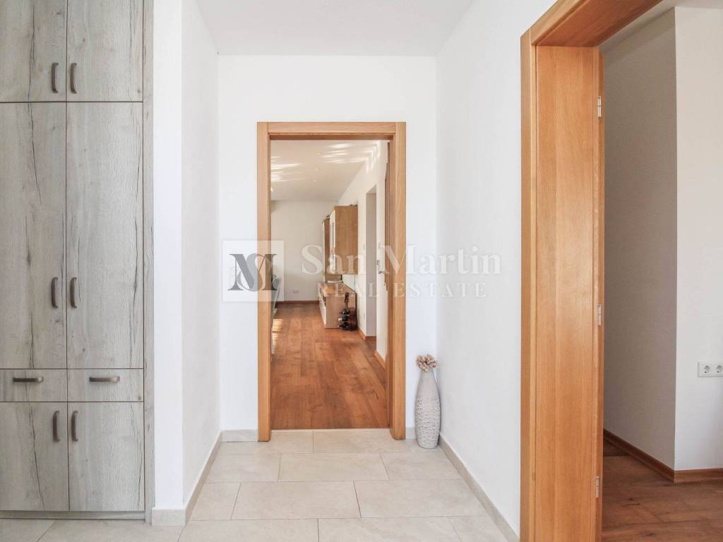 Der Innenbereich wurde sorgfältig gestaltet, um maximale Funktionalität und Komfort zu bieten. Er besteht aus drei geräumigen Schlafzimmern, drei modernen Badezimmern, einem hellen Wohnzimmer mit Essbereich, einer Küche mit Speisekammer, einer Eingangshalle, einem Dachboden und einer großzügigen, nach Süden ausgerichteten Terrasse, die zum Entspannen und geselligen Beisammensein einlädt.