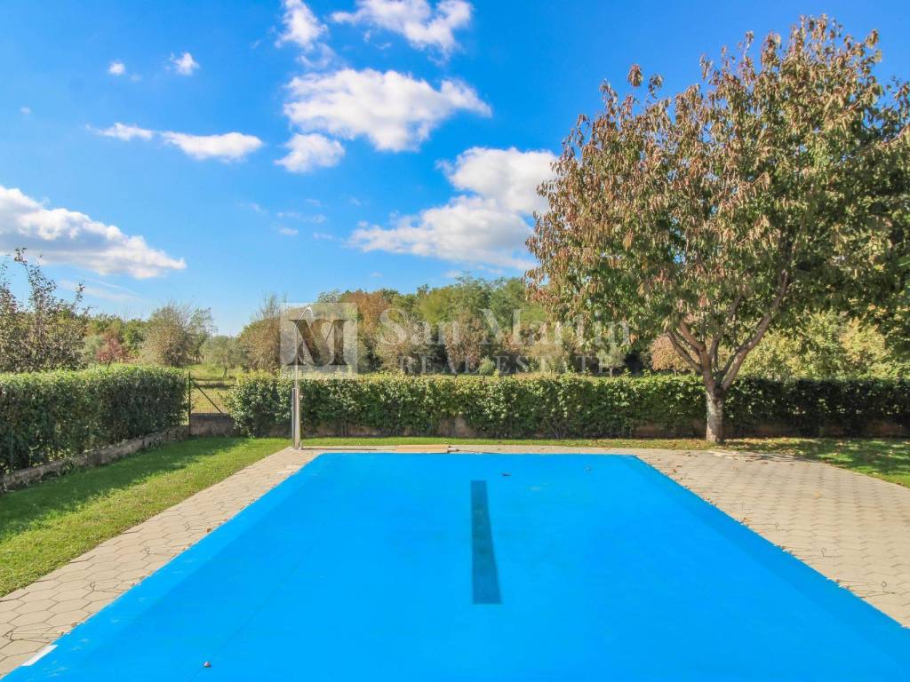 Vom Wohnzimmer gelangt man in einen gepflegten Garten mit einem Swimmingpool mit Liegewiese und zwei Parkplätzen.