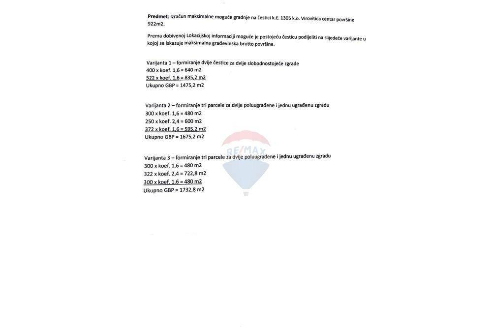 Die minimale bebaubare Fläche beträgt ca. 1.250 m für zwei Doppelhaushälften, nur im Falle neuer städtebaulicher Bedingungen und der möglichen Abtrennung eines Teils des Grundstücks für eine Zufahrtsstraße über das oben genannte Grundstück (ca. 140 m), die hinter das Gebäude des Stadtgerichts in Virovitica führt, für den Bedarf eines zukünftigen öffentlichen Parkplatzes in Virovitica mit 140 Stellplätzen auf einem anderen Grundstück.
