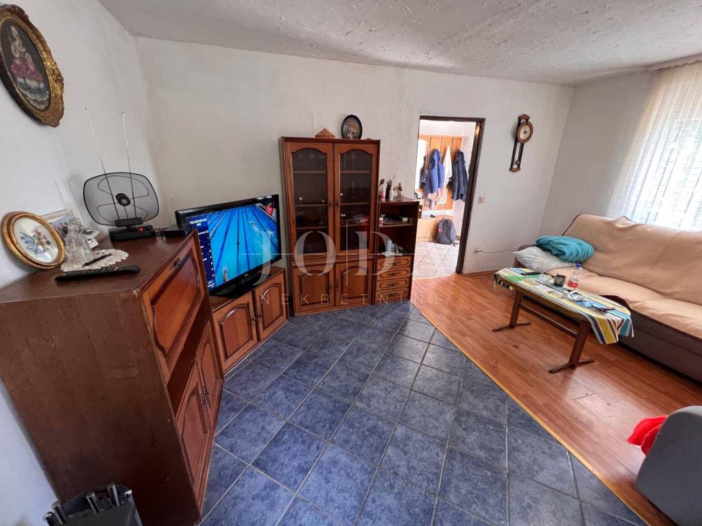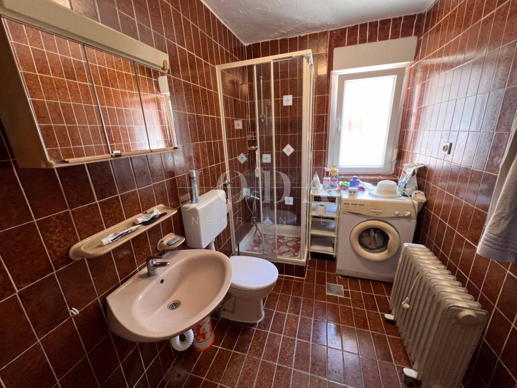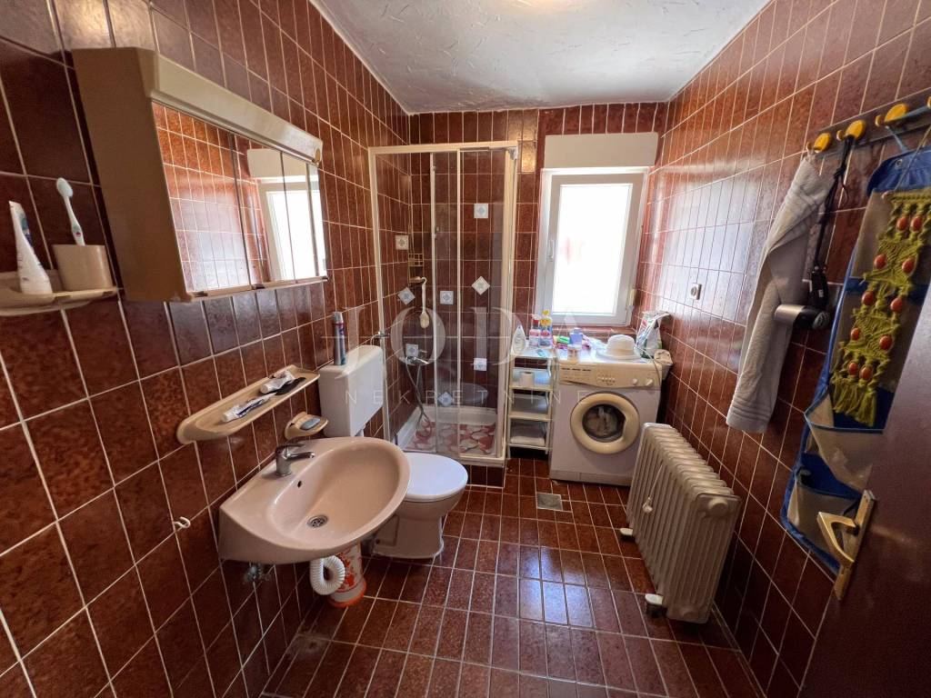 Die Wohnung im Obergeschoss besteht aus zwei Schlafzimmern, einem Wohnzimmer, einer Küche mit Esszimmer, einem Badezimmer, einem Flur und einem Balkon mit Zugang vom Wohnzimmer. Vom Balkon aus bietet sich ein herrlicher Blick auf das Meer, die Insel Krk, Velebit und Učka. Die Wohnung ist geschmackvoll eingerichtet, möbliert und in gutem Zustand.