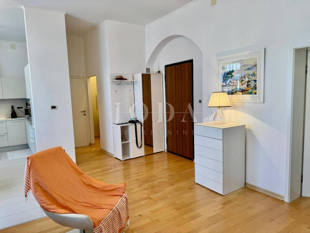 Die Wohnung besteht aus zwei Schlafzimmern, jeweils mit eigenem Bad, einem Gäste-WC sowie einer offenen Küche mit Essbereich und Wohnzimmer. Vom Wohnbereich gelangt man auf eine überdachte Terrasse von 40 m mit Meerblick eine Seltenheit in solch zentraler Lage. Zur Wohnung gehört auch ein Abstellraum von 4 m im Erdgeschoss des Gebäudes.