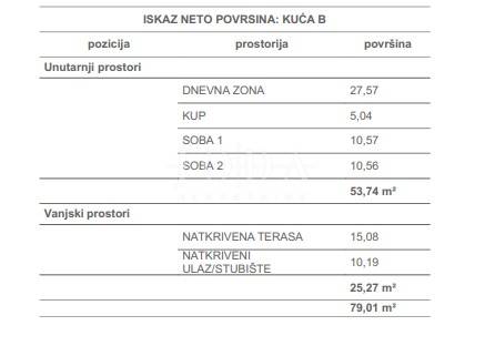 Die Wohnung im ersten Stock erstreckt sich über 79,01 m und umfasst zwei Schlafzimmer von 10,56 m und 10,57 m, ein Wohnzimmer mit einer Fläche von 27,57 m, ein Badezimmer (5,04 m) sowie eine Terrasse mit überdachtem Eingang.