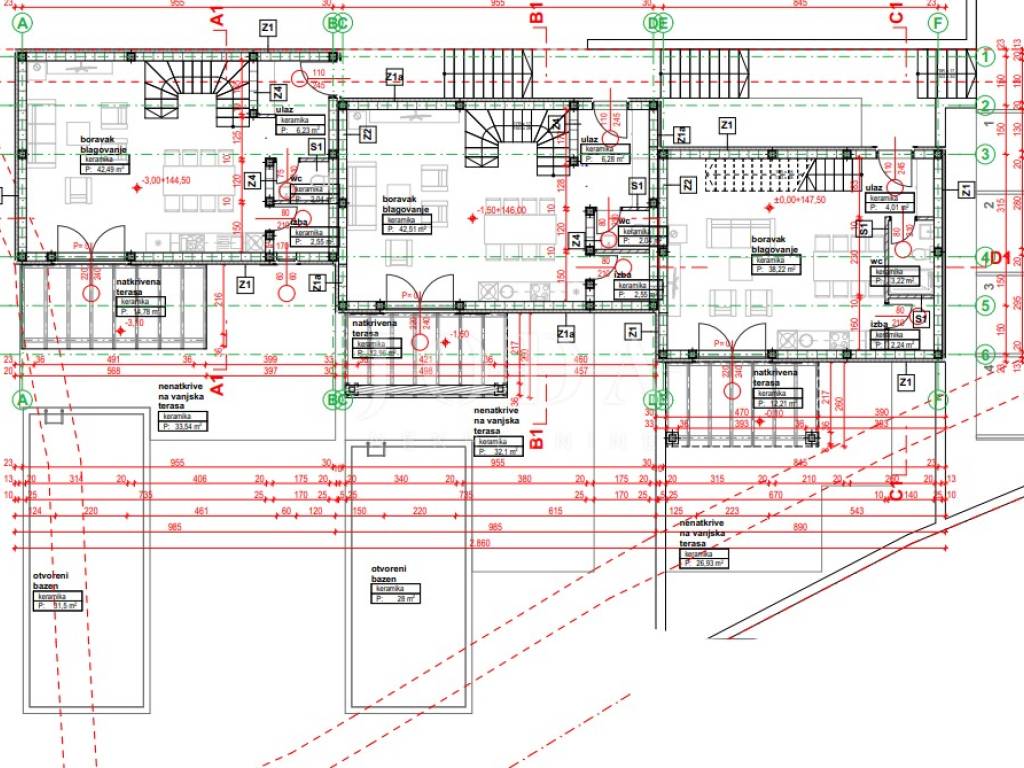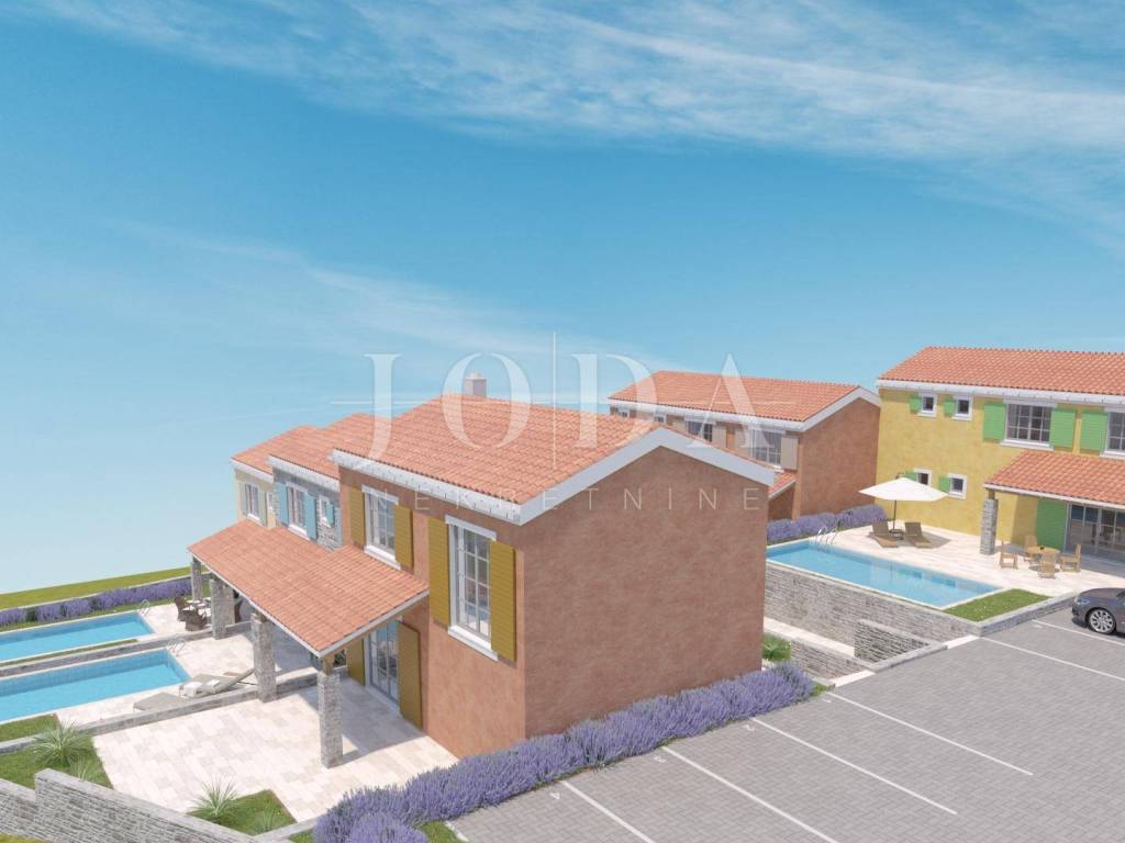 Auf dem größeren Grundstück entstanden Bauplätze für 5 Gebäude mit jeweils einem Garten und einem Swimmingpool.