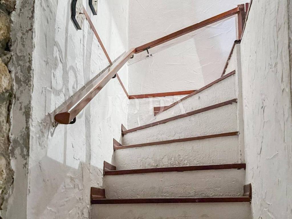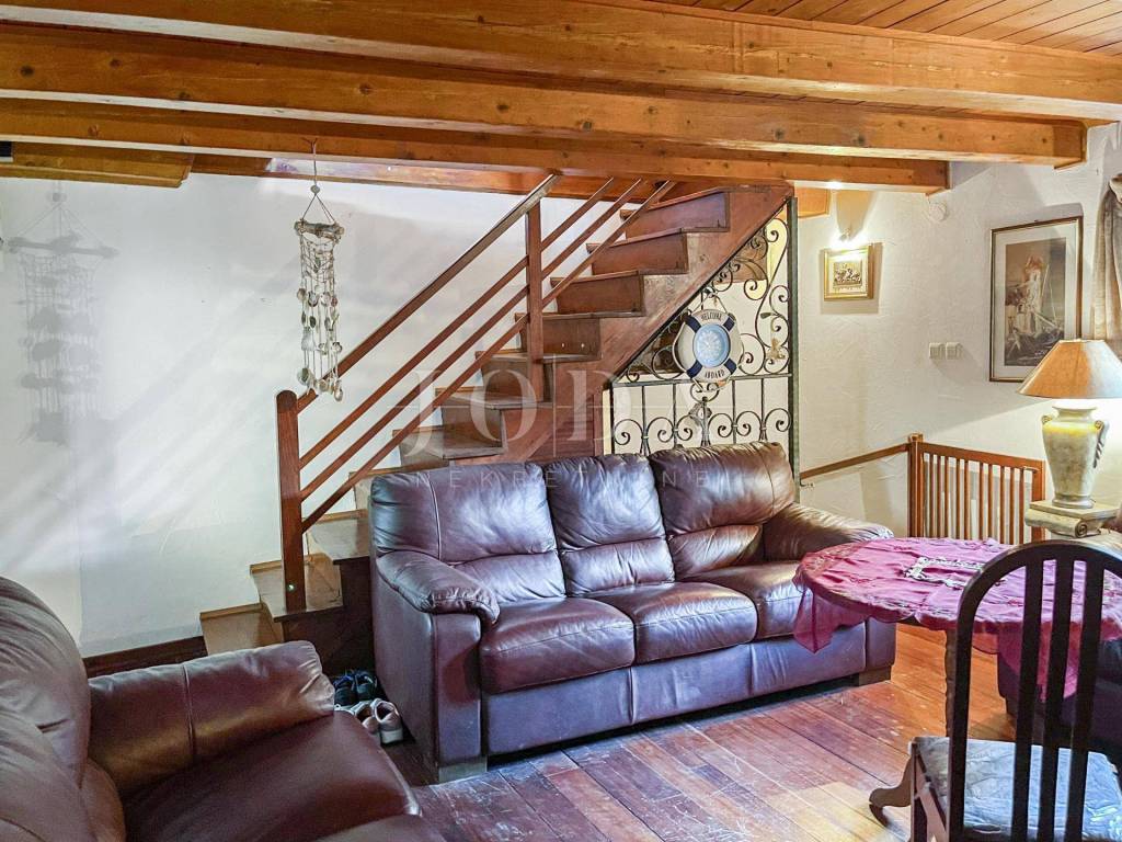 Im Erdgeschoss des Hauses befinden sich eine Küche und ein kleiner Abstellraum. Eine Treppe führt in den ersten Stock, wo sich das Wohnzimmer mit Zugang zur ersten Terrasse und ein Schlafzimmer befinden. Vom Wohnzimmer führt eine Treppe zum Badezimmer, während eine weitere Treppe in die zweite Etage führt, wo sich ein Schlafzimmer mit Zugang zur zweiten Terrasse mit Meerblick befinden.