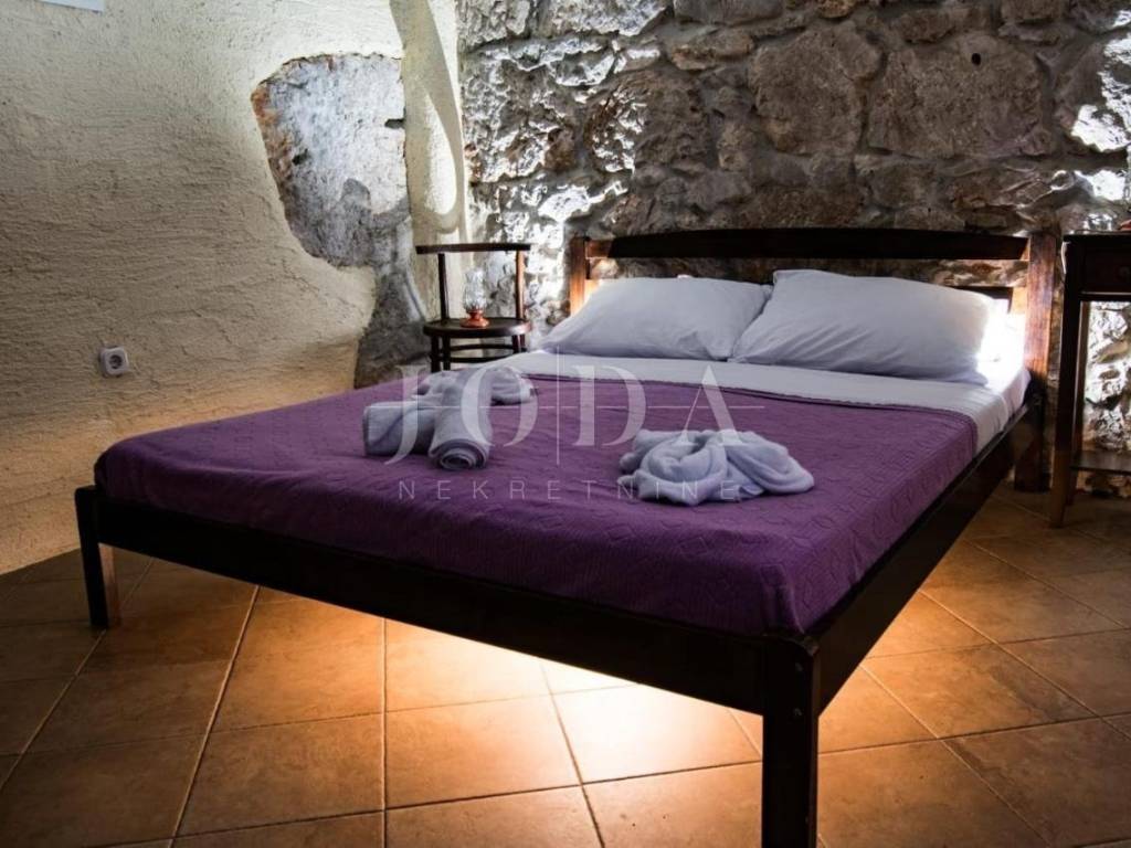 Es hat eine Fläche von 180 m2 und befindet sich in wunderschöner Lage in der Nähe von Vrbnik auf der Insel Krk. Das Haus war früher ein Kulturdenkmal. Es wurde auf einem Grundstück von 1177 m2 erbaut und besteht aus zwei separaten Wohneinheiten: Erdgeschoss - Wohnzimmer mit Küche und Esszimmer (als Taverne eingerichtet), Badezimmer, Schlafzimmer mit Zugang zu einer überdachten Veranda und Obergeschoss: geräumige Terrasse, Wohnzimmer mit Küche und Esszimmer, Badezimmer und zwei Schlafzimmer. Das Haus wurde 2010 renoviert. Auf dem großzügigen Grundstück befindet sich ein Swimmingpool mit Liegewiese und ein paar Parkplätze. Schöne, ruhige Lage, 2000 m vom Meer entfernt.