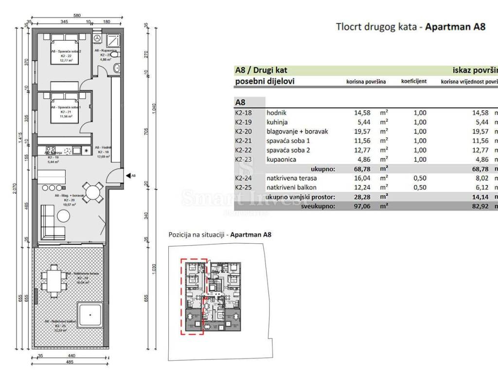 Es besteht aus einem Korridor, einem Wohnzimmer mit Küche und Essbereich, zwei Schlafzimmern, einem Badezimmer, einer überdachten Terrasse und einem überdachten Balkon (insgesamt 82,92 m2 Nettofläche), mit einem separaten Abstellraum von 4,16 m2 und einem Garagenstellplatz von 12,25 m2, was zusammen mit der Wohnfläche eine Bruttofläche von 99,33 m2 ergibt