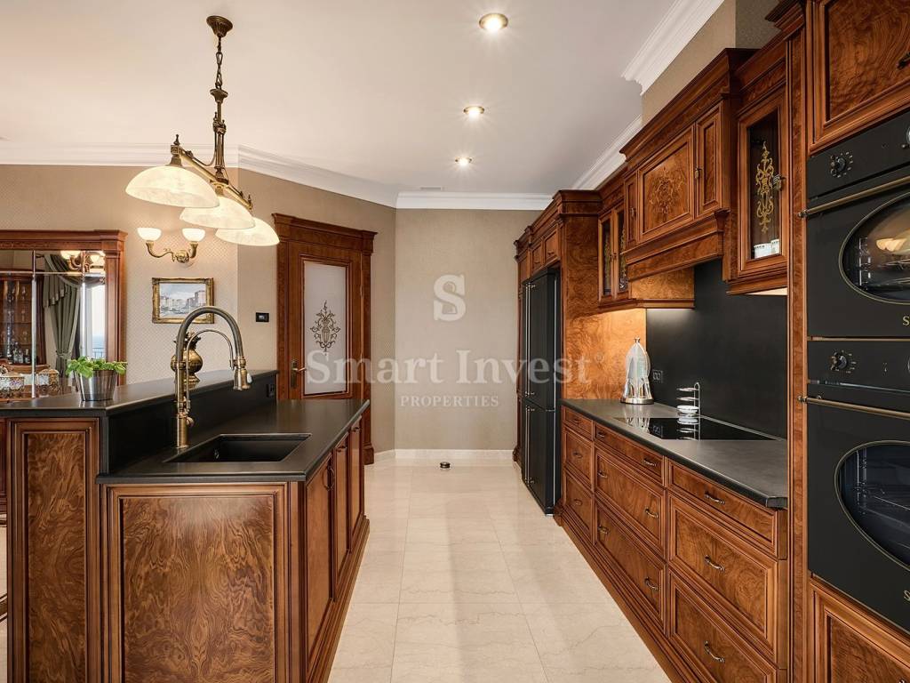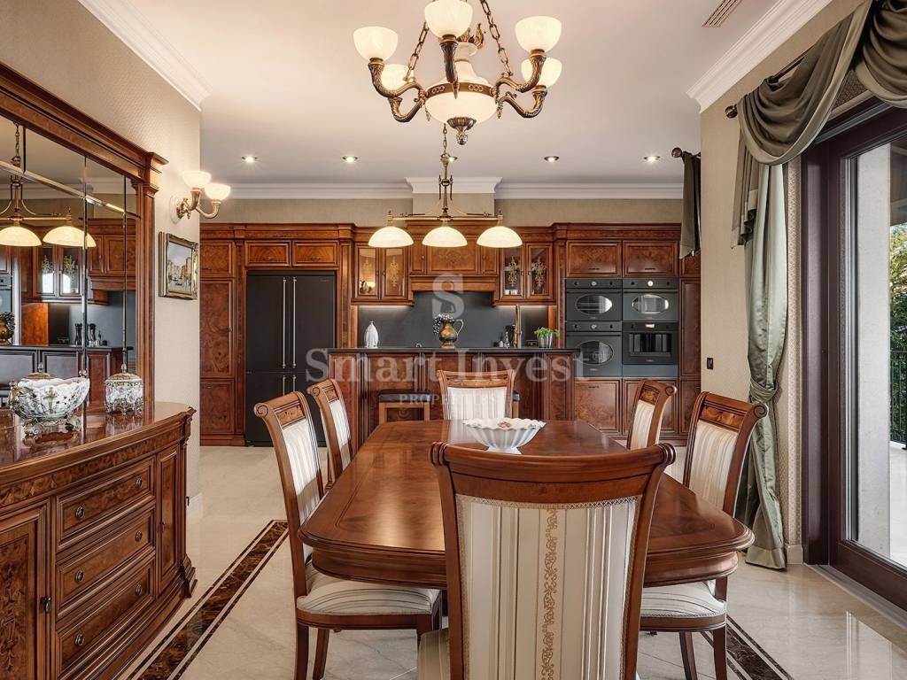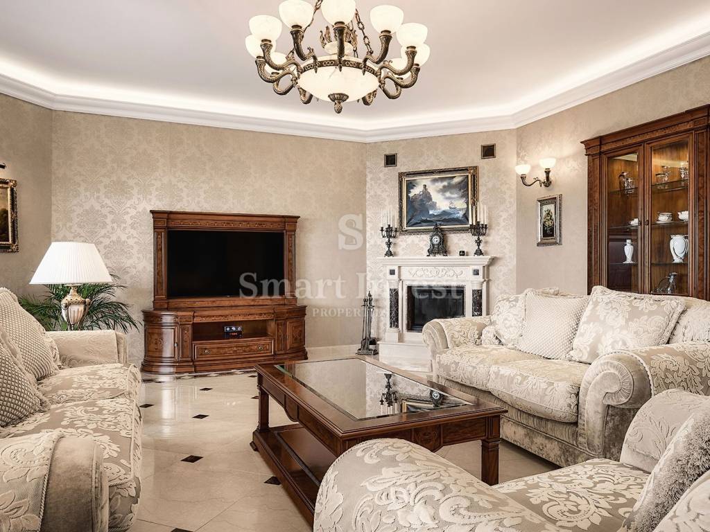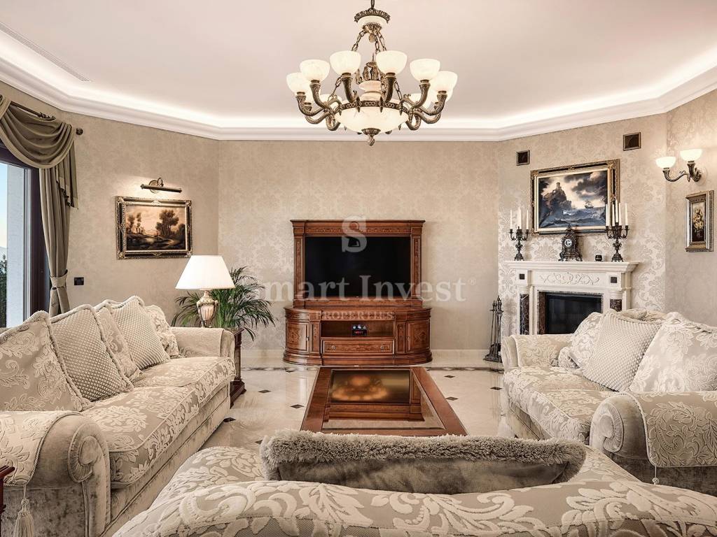Im Inneren empfängt Sie eine luxuriöse, hochwertige Ausstattung und edle Möbel. Die Böden der Villa bestehen aus edlem italienischem Botticino Classico-Marmor, kombiniert mit Emperador Dark, und schaffen so eine elegante Atmosphäre. Das Wohnzimmer verfügt über einen Kamin aus demselben Marmor, der dem Raum Raffinesse und Behaglichkeit verleiht. Die Schlafzimmer sind mit Parkett aus afrikanischer Eiche des deutschen Herstellers HARO ausgelegt, das sich durch seine Langlebigkeit und ausdrucksstarke Maserung auszeichnet. Die Badezimmer sind mit Sanitärkeramik von Olympia Ceramica (Italien) ausgestattet, die den Gesamtstil des Hauses unterstreicht. Die Wände sind mit der Velatura-Technik des Herstellers San Marco (Italien) gestaltet, die Tapeten stammen von Portofino (Italien) und die Keramikfliesen von Piemme Valentino (Italien), was dem Interieur ein exklusives Aussehen verleiht. Türen und Möbel wurden vom spanischen Hersteller Muebles Cercos gefertigt, und die Küche ist mit hochwertigen Smeg-Haushaltsgeräten ausgestattet.
