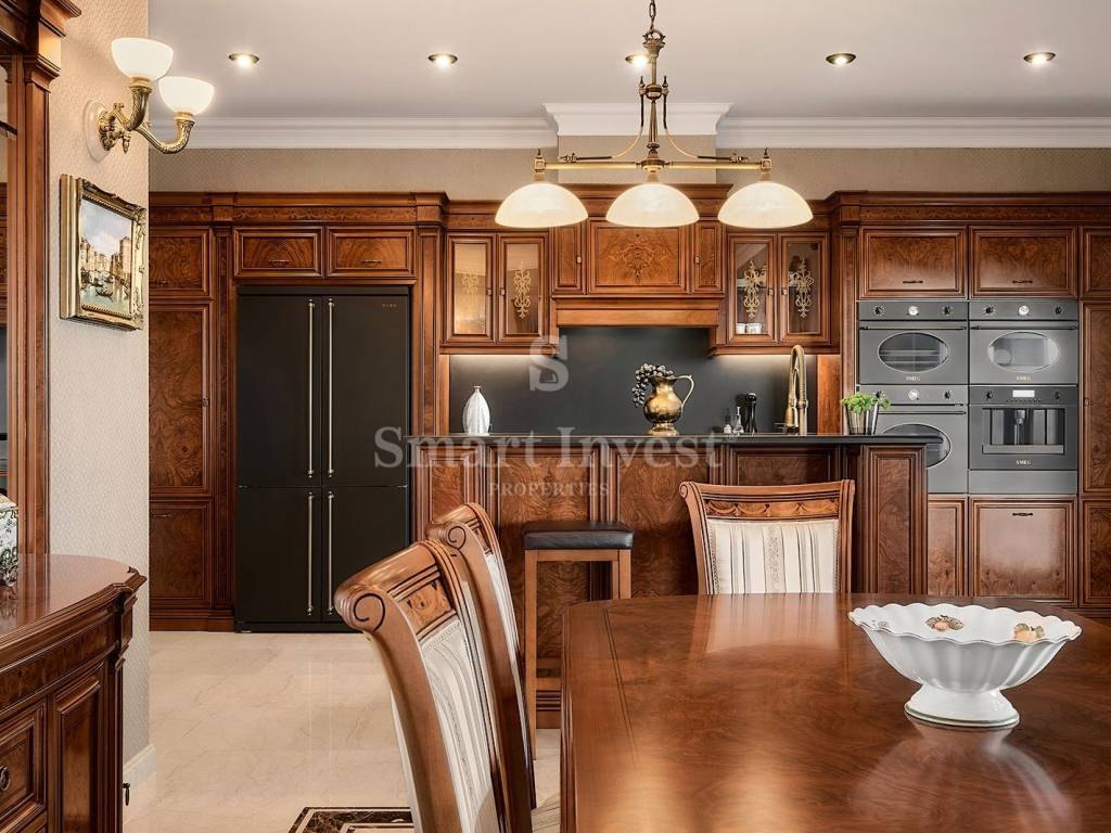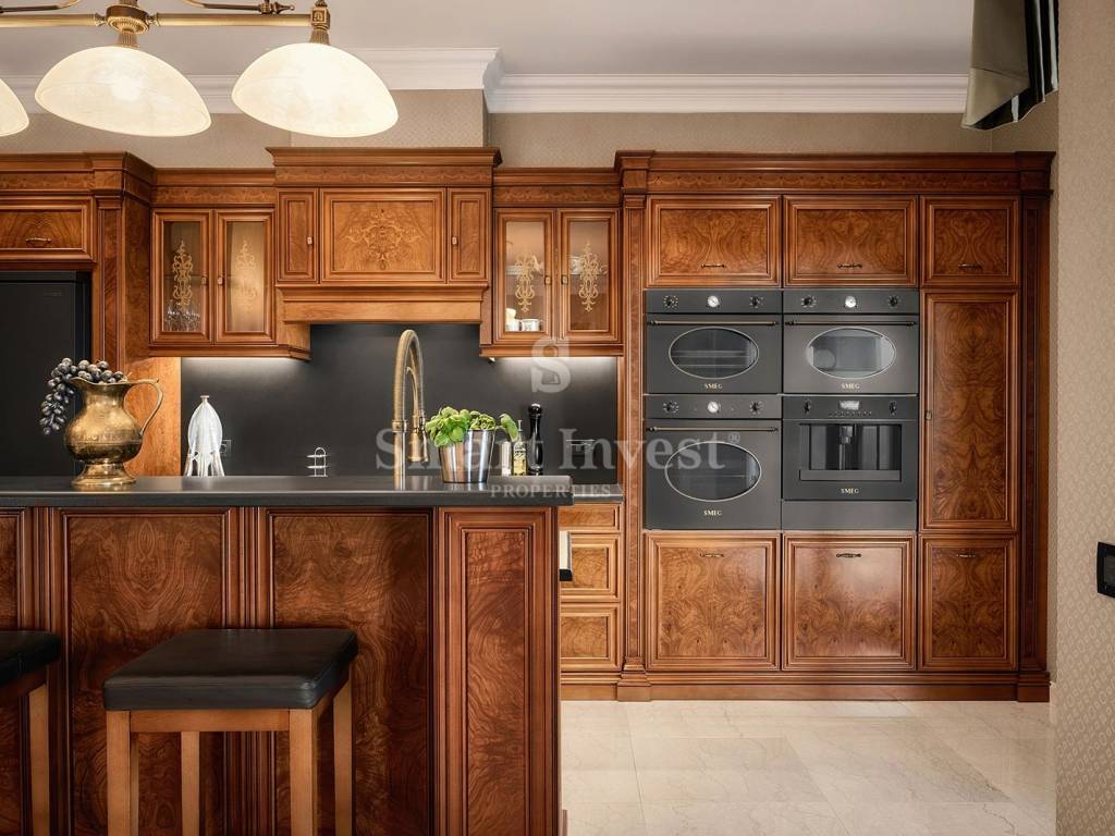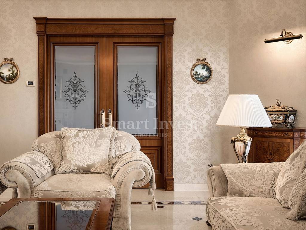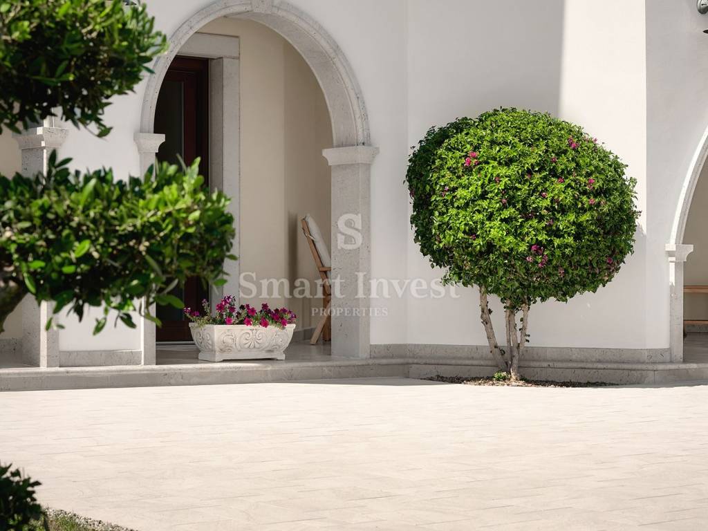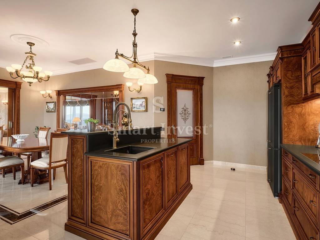Im Inneren empfängt Sie eine luxuriöse, hochwertige Ausstattung und edle Möbel. Die Böden der Villa bestehen aus edlem italienischem Botticino Classico-Marmor, kombiniert mit Emperador Dark, und schaffen so eine elegante Atmosphäre. Das Wohnzimmer verfügt über einen Kamin aus demselben Marmor, der dem Raum Raffinesse und Behaglichkeit verleiht. Die Schlafzimmer sind mit Parkett aus afrikanischer Eiche des deutschen Herstellers HARO ausgelegt, das sich durch seine Langlebigkeit und ausdrucksstarke Maserung auszeichnet. Die Badezimmer sind mit Sanitärkeramik von Olympia Ceramica (Italien) ausgestattet, die den Gesamtstil des Hauses unterstreicht. Die Wände sind mit der Velatura-Technik des Herstellers San Marco (Italien) gestaltet, die Tapeten stammen von Portofino (Italien) und die Keramikfliesen von Piemme Valentino (Italien), was dem Interieur ein exklusives Aussehen verleiht. Türen und Möbel wurden vom spanischen Hersteller Muebles Cercos gefertigt, und die Küche ist mit hochwertigen Smeg-Haushaltsgeräten ausgestattet.