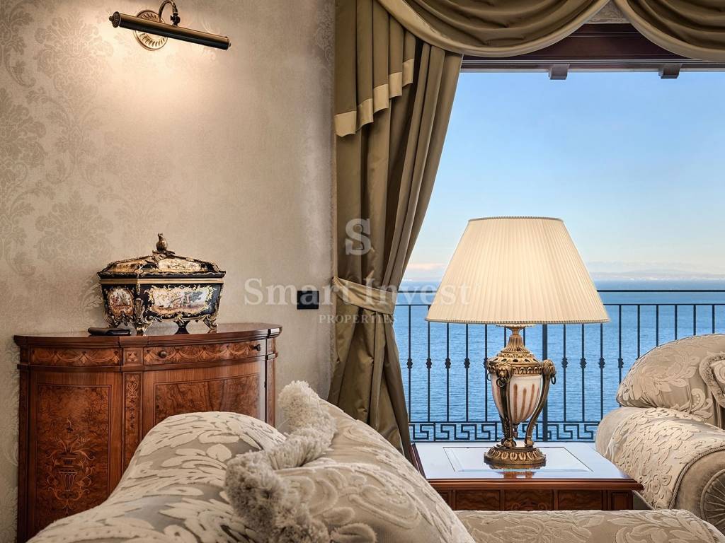 Der Haupteingang der Villa befindet sich im ersten Stock. Dort empfängt Sie eine elegante Eingangshalle mit angrenzendem Hauswirtschaftsraum und einem geräumigen begehbaren Kleiderschrank. Die luxuriöse Halle bildet einen angenehmen Übergang zum zentralen Bereich der Villa. Dieser besteht aus einem großzügigen Wohnzimmer mit Kamin, einer hervorragend ausgestatteten Küche und einem Esszimmer. Die offene Gestaltung und die fließenden Übergänge schaffen die perfekte Atmosphäre für gesellige Stunden mit der Familie. Vom Wohnzimmer aus gelangen Sie auf eine luxuriöse Terrasse mit atemberaubendem Blick auf das Meer und die vorgelagerten Inseln. Auf dieser Etage befinden sich außerdem ein geräumiges Arbeitszimmer mit einem ruhigen Rückzugsort zum konzentrierten Arbeiten sowie ein separates WC.