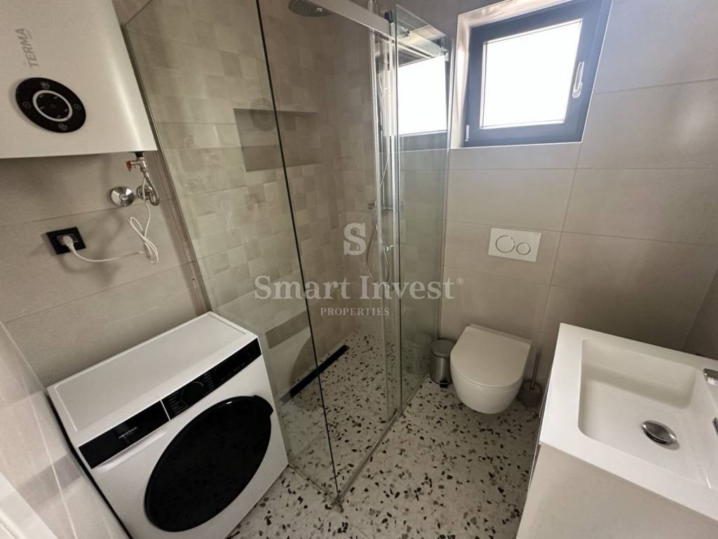 Die Wohnung hat eine Gesamtfläche von 60 m, befindet sich im 1. Stock und besteht aus einem Schlafzimmer, Badezimmer, Küche und Wohnzimmer mit Essbereich sowie einem großzügigen überdachten Balkon/Terrasse mit Meerblick.