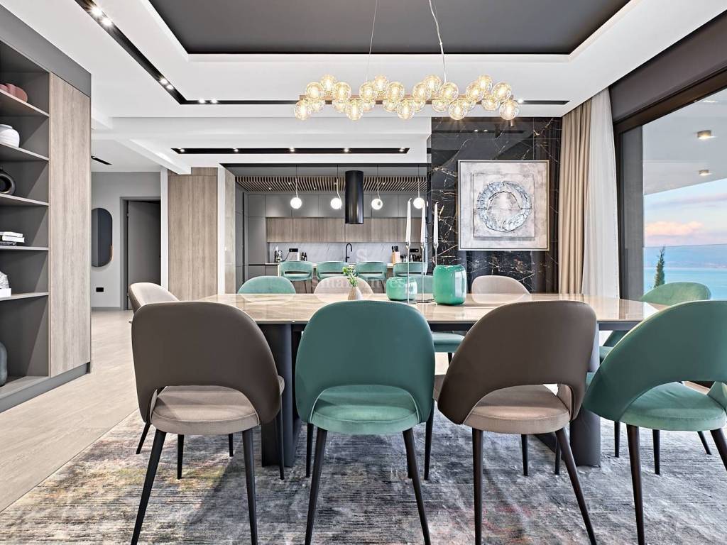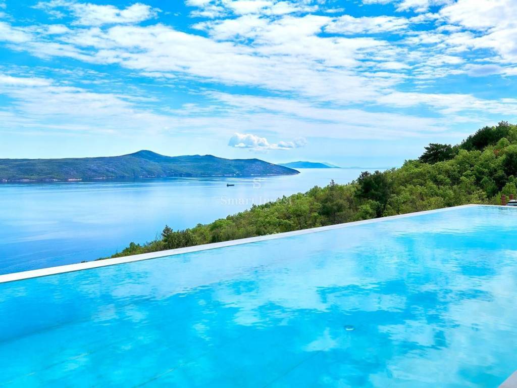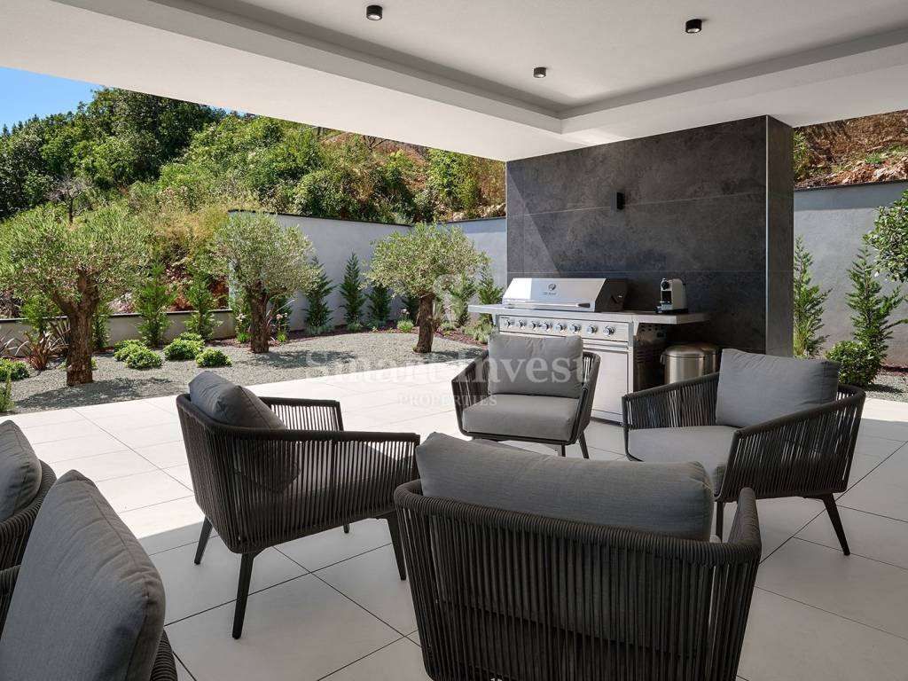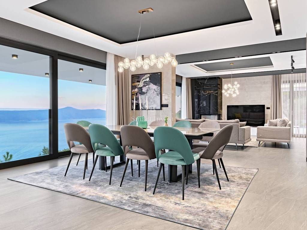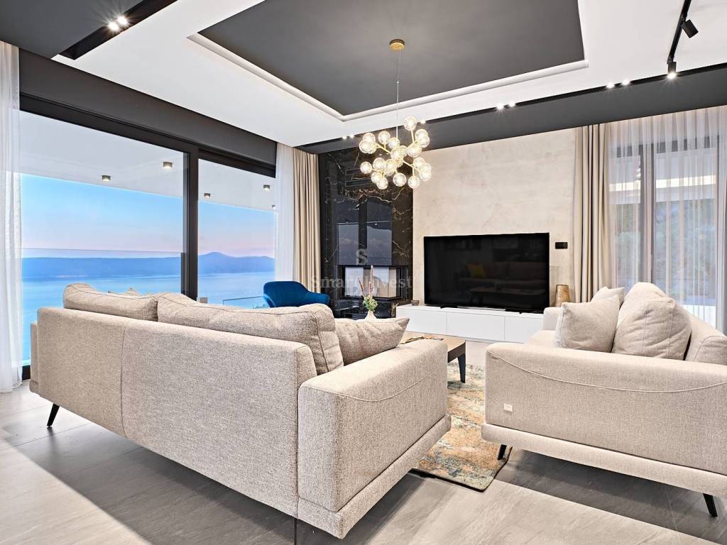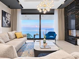 Diese architektonisch moderne Villa ist vollständig mit hochwertiger italienischer Designer-Möbel ausgestattet und bietet Ihnen ultimativen Luxus und Komfort. Im Erdgeschoss stehen Ihnen ein 43 m2 Infinity-Pool mit Sonnenterrasse und fantastischem Meerblick, eine geräumige überdachte Terrasse, eine offene Küche mit Essbereich und Wohnzimmer sowie ein Gäste-WC zur Verfügung. Auf dieser Ebene befindet sich auch der Technikraum, in dem alle Heizungs- und Kühlsysteme untergebracht sind, die nach schweizerischen Standards installiert wurden: Heizung mit Wärmepumpen, Fußbodenheizung, Solarheizung für Warmwasser und eine Vorbereitung für die Solaranlage zur Beheizung der gesamten Villa. Große Glaswände entlang der gesamten Länge des Wohnzimmers und der Küche bieten einen wunderschönen offenen Blick auf das Blau der Kvarner Bucht, während der Kamin im Wohnzimmer eine warme Winteratmosphäre schafft.
