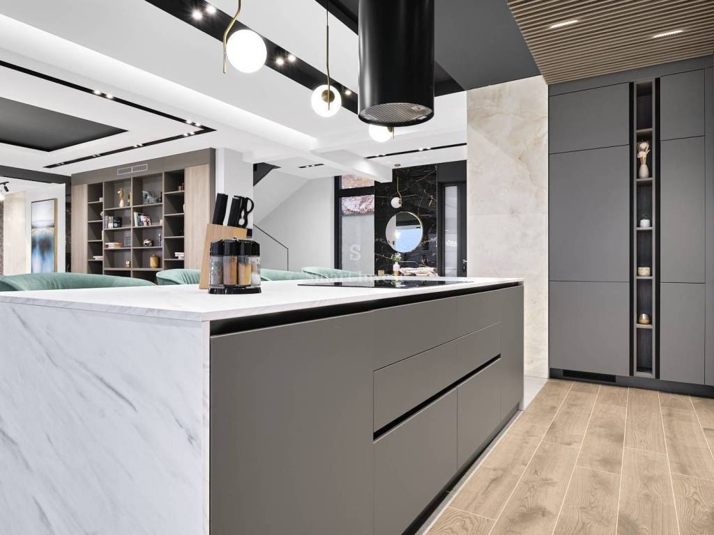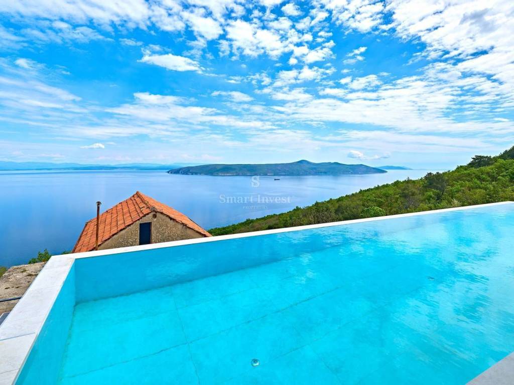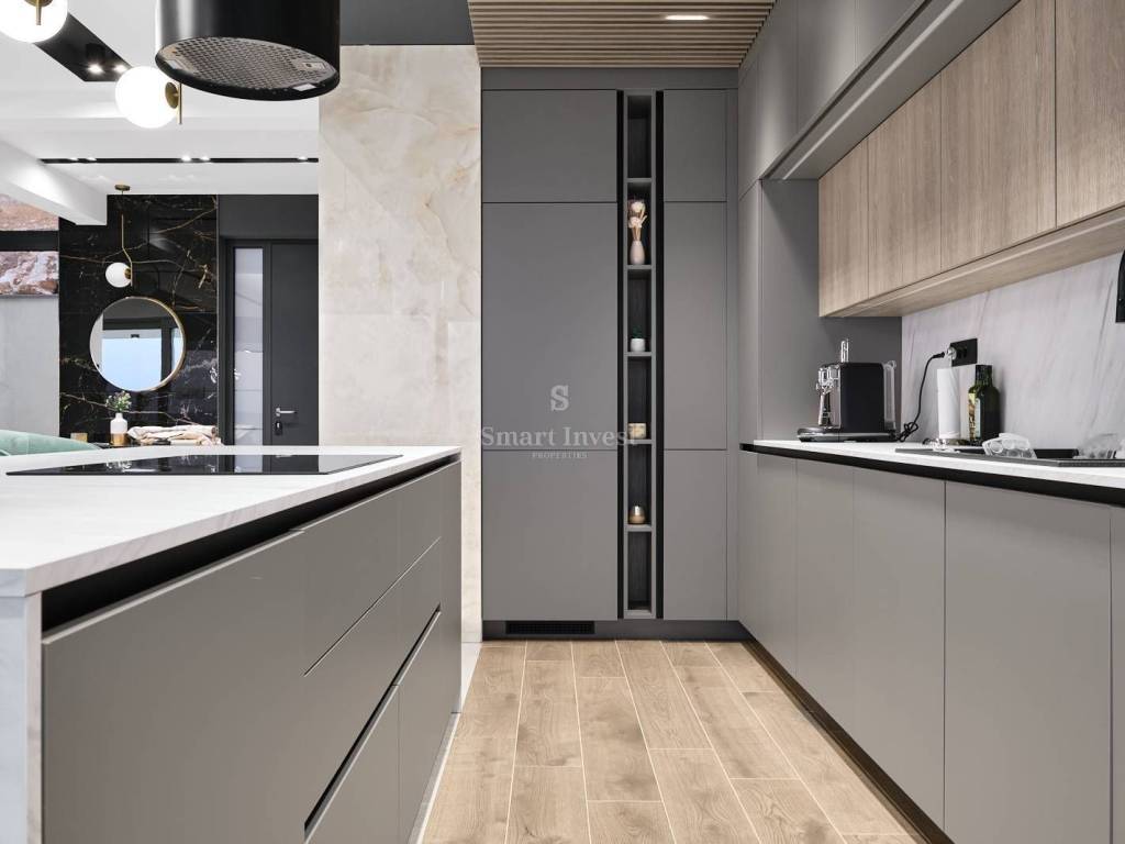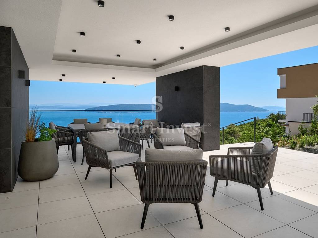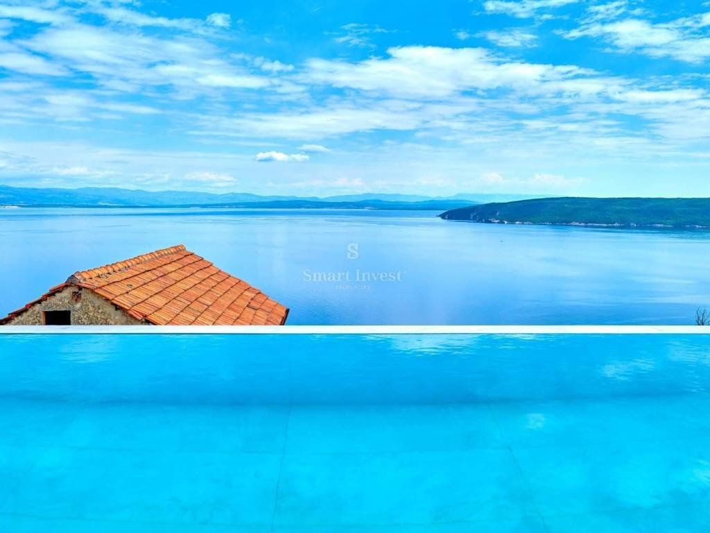 Diese architektonisch moderne Villa ist vollständig mit hochwertiger italienischer Designer-Möbel ausgestattet und bietet Ihnen ultimativen Luxus und Komfort. Im Erdgeschoss stehen Ihnen ein 43 m2 Infinity-Pool mit Sonnenterrasse und fantastischem Meerblick, eine geräumige überdachte Terrasse, eine offene Küche mit Essbereich und Wohnzimmer sowie ein Gäste-WC zur Verfügung. Auf dieser Ebene befindet sich auch der Technikraum, in dem alle Heizungs- und Kühlsysteme untergebracht sind, die nach schweizerischen Standards installiert wurden: Heizung mit Wärmepumpen, Fußbodenheizung, Solarheizung für Warmwasser und eine Vorbereitung für die Solaranlage zur Beheizung der gesamten Villa. Große Glaswände entlang der gesamten Länge des Wohnzimmers und der Küche bieten einen wunderschönen offenen Blick auf das Blau der Kvarner Bucht, während der Kamin im Wohnzimmer eine warme Winteratmosphäre schafft.
