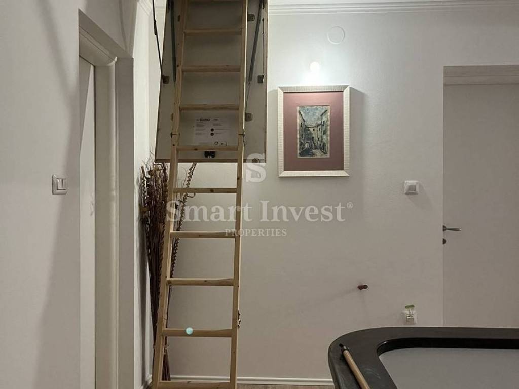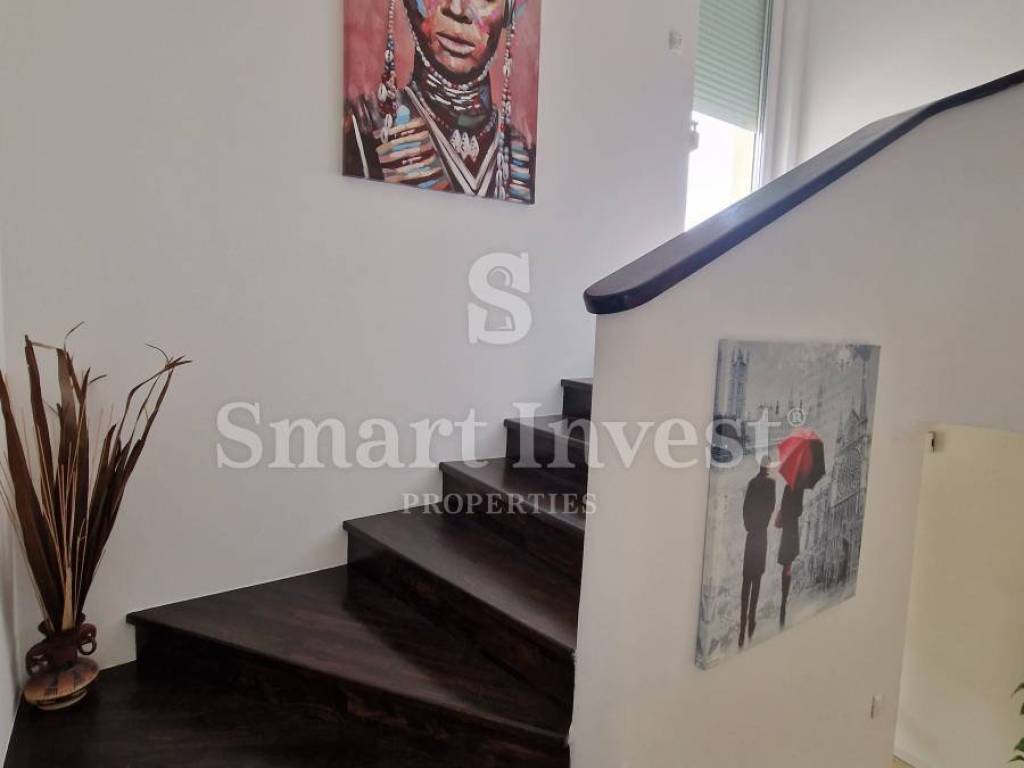 Die Hauptwohnung erstreckt sich über zwei Etagen mit insgesamt 255 m. Im unteren Bereich befindet sich ein großes Wohnzimmer mit Kamin, Küche, Esszimmer und Bad. Im oberen Stockwerk gibt es drei Schlafzimmer, ein großes Bad und einen begehbaren Kleiderschrank. Der gesamte Raum strahlt Wärme und Gemütlichkeit aus perfekt für große Familien.