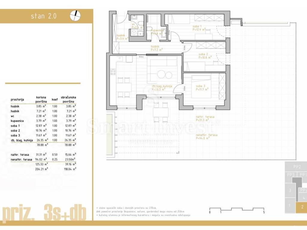 WOHNUNG 2.0 - Erdgeschoss, mit einer Nettofläche von 118,04 m2 besteht aus einem Flur, einer Toilette, einem Wohnzimmer mit Küche und Essbereich, 3 Schlafzimmern, einem Badezimmer (die Gesamtinnenfläche beträgt 78,87 m2) und einer überdachten Terrasse von 31,31 m2 und nicht überdachter Terrasse von 94,02 m2. Die Wohnung verfügt außerdem über einen separaten Abstellraum SP30 von 2,37 m2.