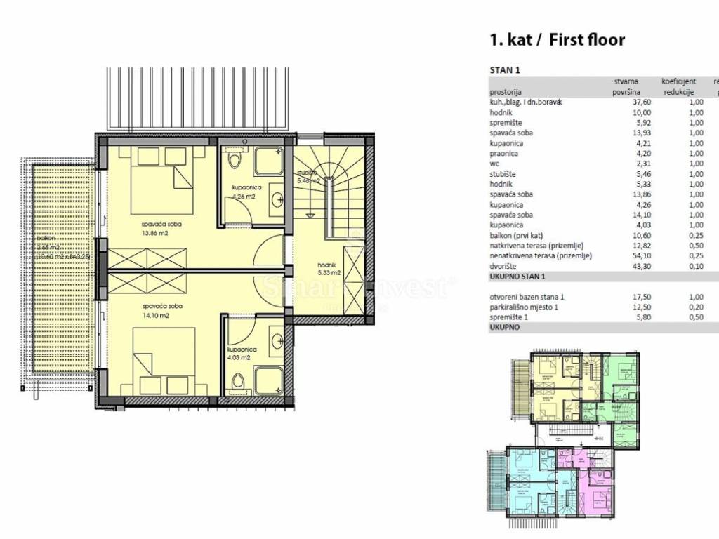 WOHNUNG S1 mit einer Nettonutzfläche von 152,13 m2, im Erdgeschoss und im 1. Stock gelegen, verfügt über 3 Schlafzimmer, 3 Badezimmer + 1 WC.