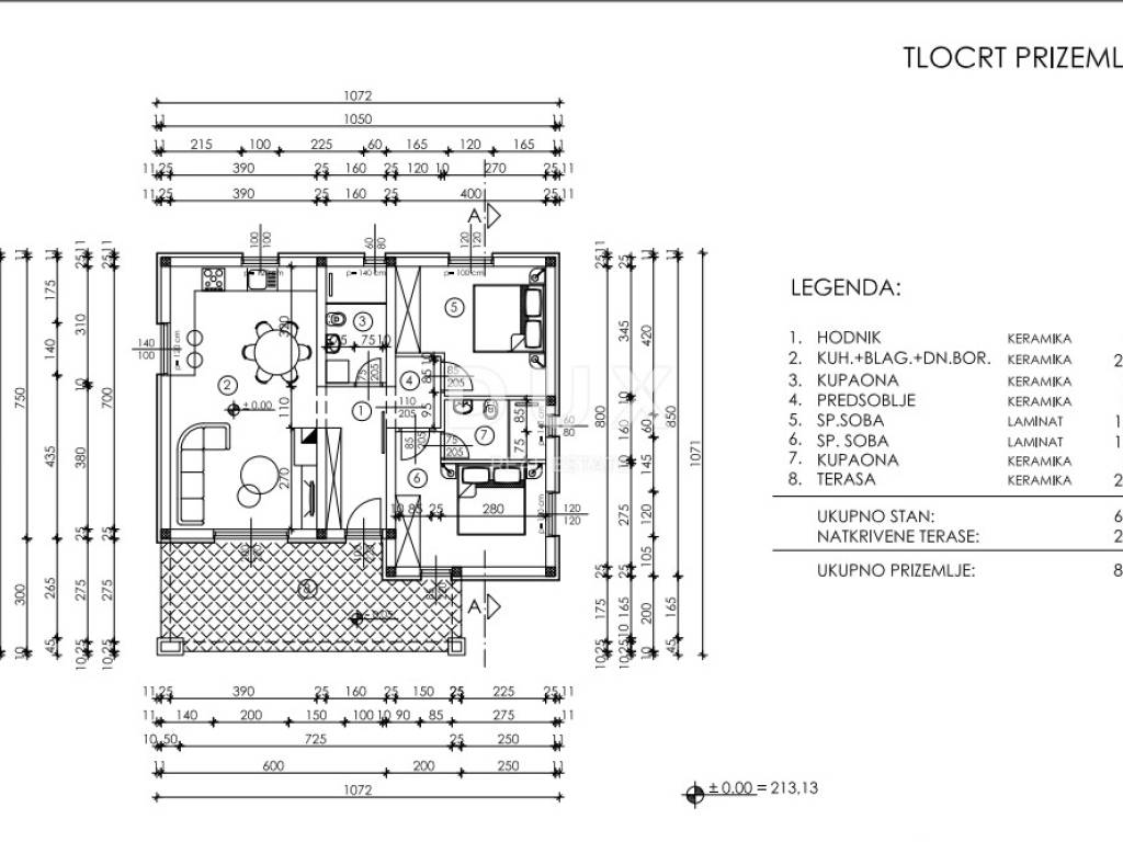 Die Baugenehmigung bezieht sich auf den Bau eines einstöckigen Hauses mit Flur, Küche mit Ess- und Wohnzimmer, Flur, zwei Schlafzimmern, zwei Bädern und einer überdachten Terrasse (20 m).
