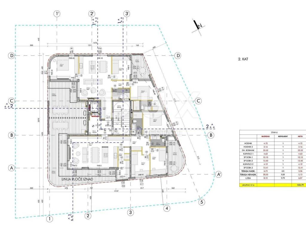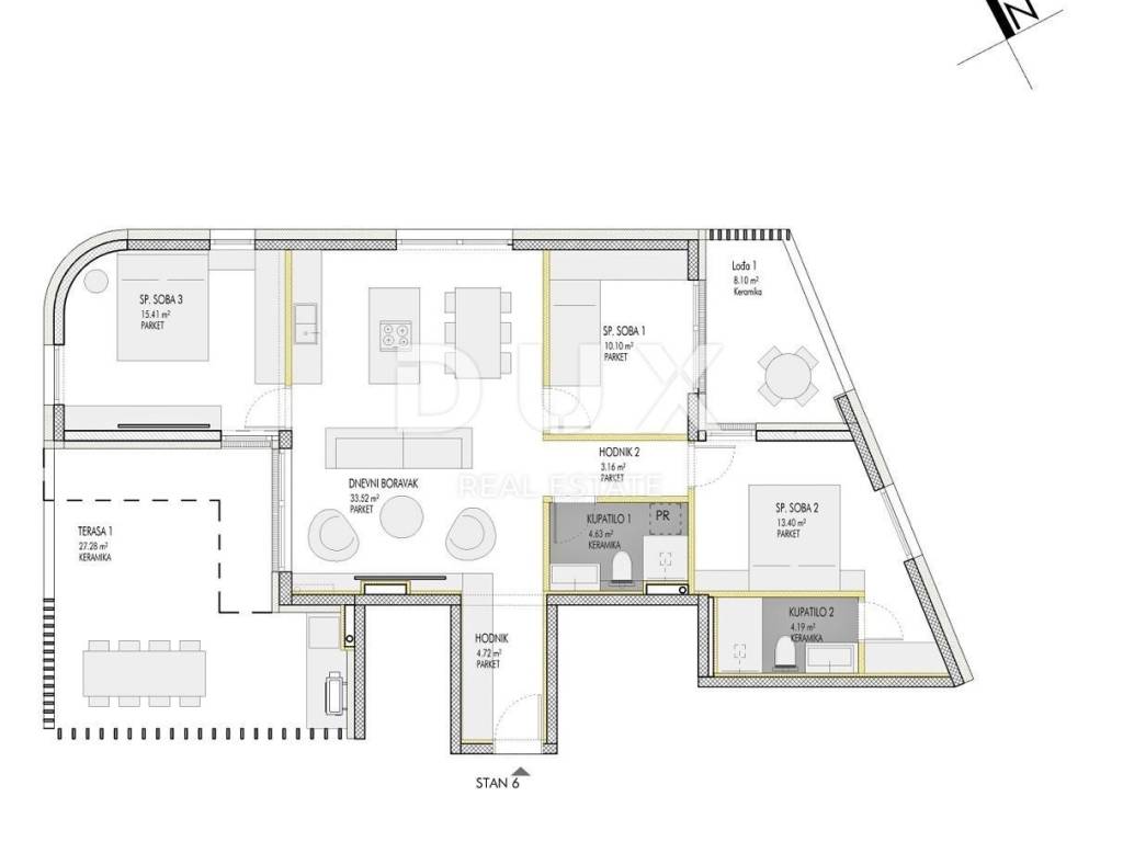 Umag ist eine attraktive istrische Stadt im äußersten Westen der kroatischen Küste und ist gut mit anderen europäischen Ländern verbunden. Umag, die Stadt des Tourismus und des Sports, verbirgt eine reiche Geschichte, die man bei einem Spaziergang entlang der schönen Straßen und Promenaden am Meer spüren kann, und die alten Gebäude in Kombination mit den modernen Teilen der Küste sind eine tolle Kombination. Die Stadt und ihre Umgebung zeichnen sich durch ein äußerst mildes mediterranes Klima, viele Sonnentage und ein außergewöhnlich sauberes Meer aus. Umag ist eine kleine Stadt mit einer sehr verzweigten und interessanten Küste mit einer Vielzahl von Stränden. Von Sand und Kies über Stein und Beton bis hin zu Felsstränden. Im Hinterland gibt es wunderschöne hügelige Festungsorte mit unglaublicher Aussicht und einer erstaunlichen Vergangenheit sowie viele Bauernhöfe mit autochthonen Köstlichkeiten und freundlichen Gastgebern. Umag besteht aus 23 Siedlungen. In einem Vorort der Stadt Umag, weit genug entfernt von Menschenmassen und Lärm, aber dennoch nah am Meer und allen städtischen Einrichtungen, entsteht ein Wohngebäude moderner Architektur, das sich über das Erdgeschoss und zwei Etagen erstreckt und eine Gesamtfläche umfasst von sechs Wohneinheiten. Bei der Konstruktion werden langlebige und zuverlässige Materialien verwendet, die langfristige Zufriedenheit und Sicherheit des Wohnens garantieren, darunter erstklassige Sanitärkeramik und Fliesen sowie Aluminiumschreinereiarbeiten mit Stopsol-Glas und elektrischen Rollläden. Das Gebäude verfügt außerdem über einen Aufzug und auf dem Parkplatz befindet sich eine Ladestation für Elektrofahrzeuge. Die Raumplanung jeder Etage wurde detailliert durchgeführt, was zu einer Kombination aus Ästhetik, Funktionalität und Komfort jeder Wohnung führte. Beim Verkaufsgegenstand handelt es sich um eine Wohnung mit einer Fläche von 103,79 m, gelegen im zweiten Stock des Gebäudes. Es besteht aus einem offenen Raumkonzept, das Küche, Esszimmer und Wohnzimmer, drei Schlafzimmer, zwei Badezimmer, Flur, Terrasse und Loggia vereint. Das Wohnzimmer und ein Schlafzimmer haben Zugang zur Terrasse, während zwei Schlafzimmer Zugang zur Loggia haben. Diese Wohnung in einem hochwertigen Neubau ist eine ideale Gelegenheit für ein komfortables Familienleben sowie eine Investition zur touristischen Vermietung. Das Projekt befindet sich derzeit im Bau und steht schlüsselfertig zum Verkauf. Der Verkäufer der betreffenden Immobilie ist eine juristische Person. Sehr geehrte Kunden, die Agenturprovision wird gemäß den Allgemeinen Geschäftsbedingungen berechnet: www.dux-nekretnine.hr/opci-uvjeti-poslovanja