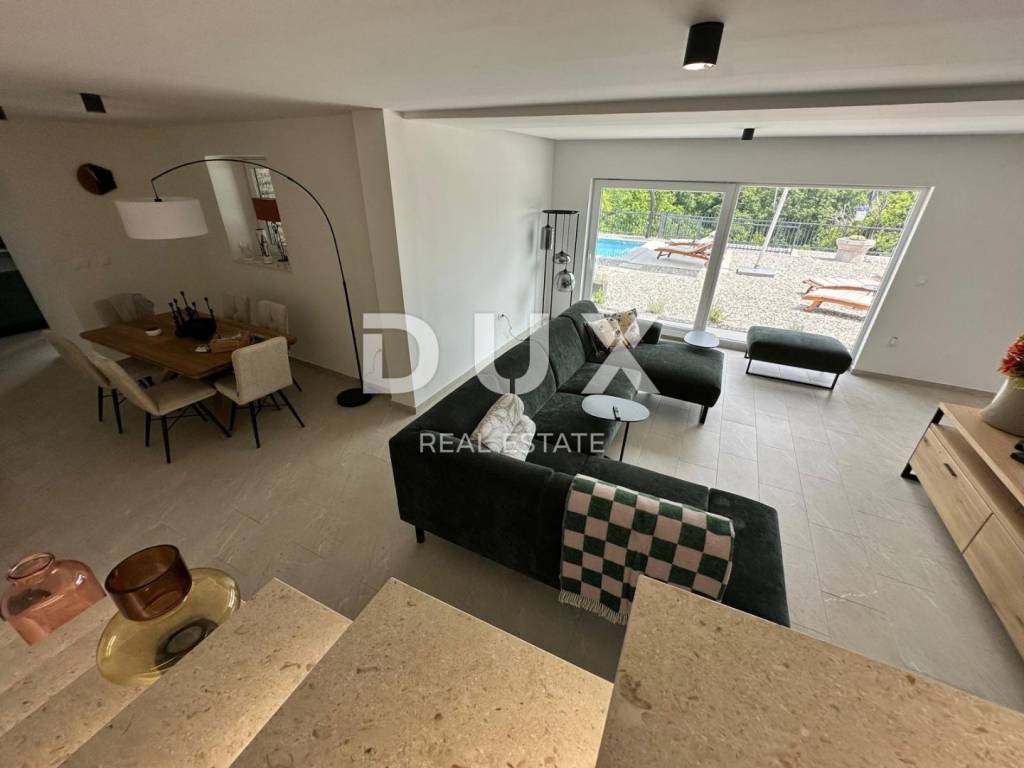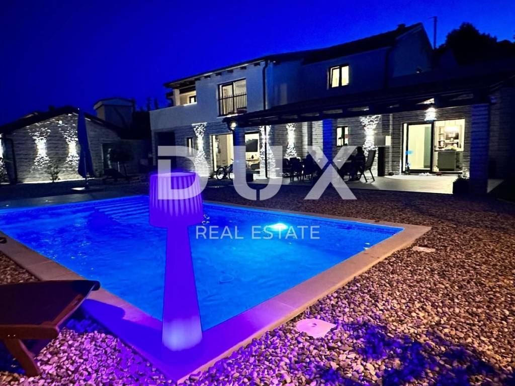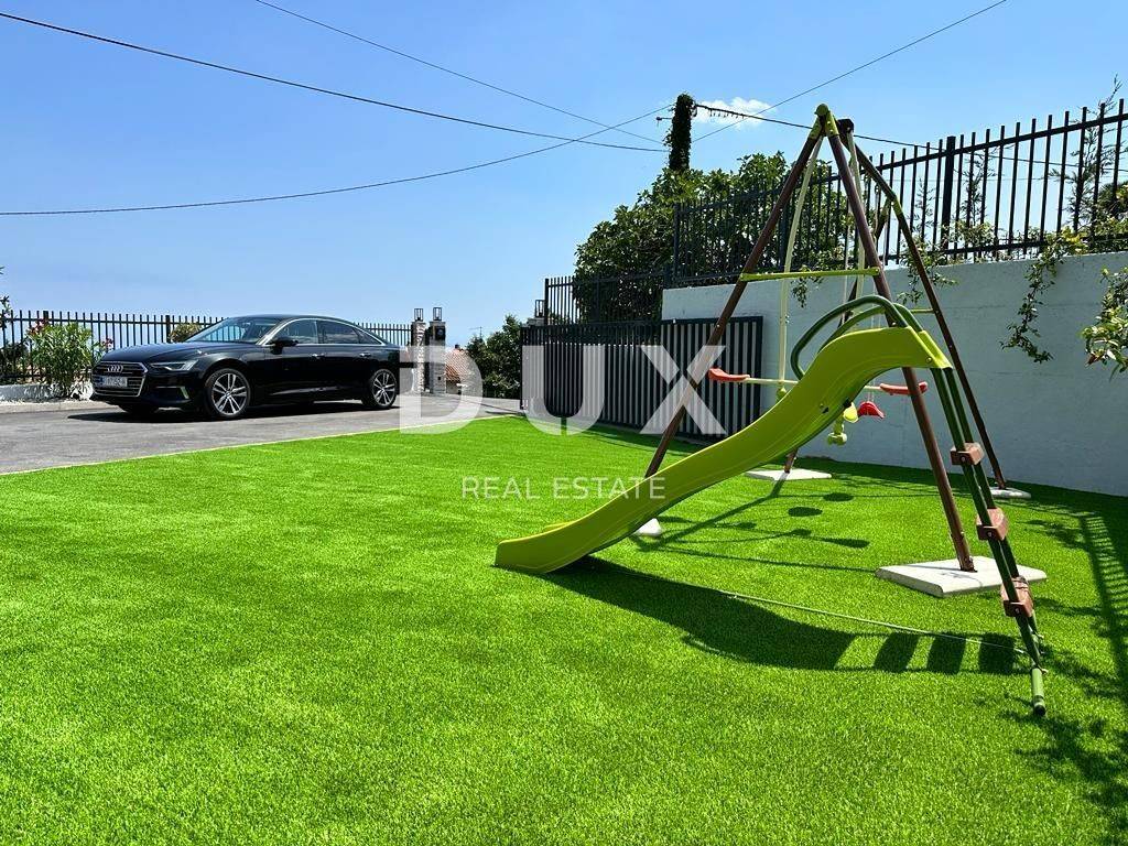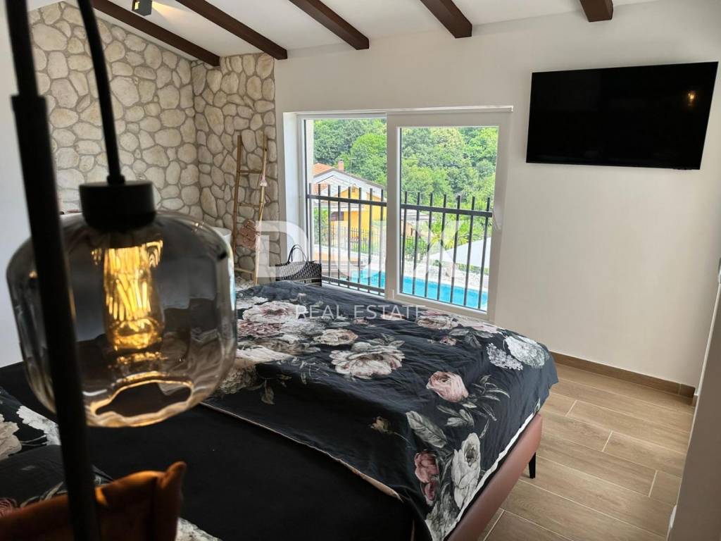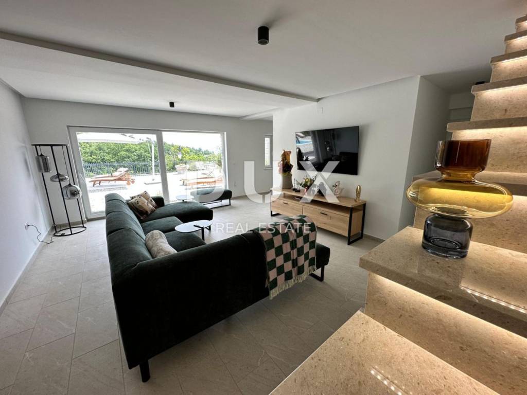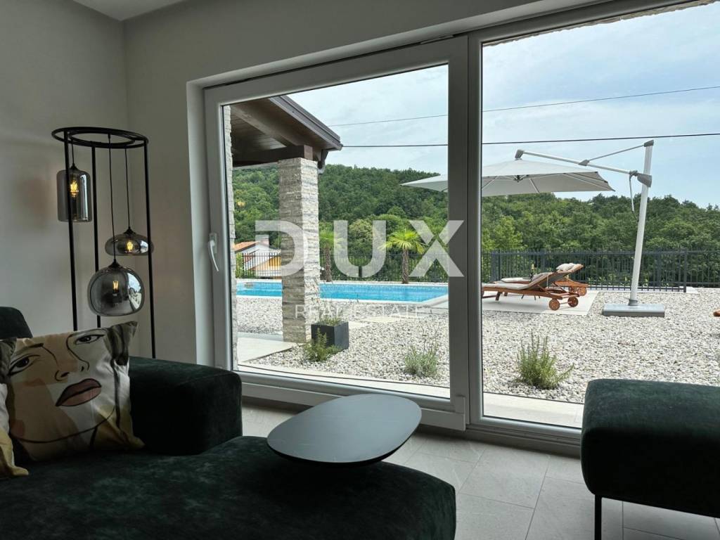 Wir bieten Ihnen die einmalige Gelegenheit, Eigentümer dieser wunderschönen Villa zu werden, die in einer abgeschiedenen Gegend in der Nähe von Opatija liegt. Dieses hochwertig gebaute Haus von 328 m mit einem wunderschön angelegten Garten von 870 m begeistert mit seinem Luxus und dem spektakulären Meerblick. Im Erdgeschoss gibt es ein geräumiges offenes Wohn- und Esszimmer, eine moderne Küche, ein Schlafzimmer mit Bad und eine Gästetoilette. Von der Küche und dem Wohnzimmer aus können Sie auf eine großzügige überdachte Terrasse (42 m2) oder in den Garten gehen, wo es einen Holzkamin gibt, der an kälteren Tagen eine besondere Atmosphäre und Wärme schafft. Im Obergeschoss befinden sich drei geräumige Schlafzimmer, jedes mit eigenem Bad und privaten Balkonen (32 m2), die einen unglaublichen freien Blick auf das Meer und die umliegende Natur bieten. Der Genuss dieser Villa beschränkt sich nicht nur auf die Sommermonate, denn die Heizung und Kühlung ist vollständig über WLAN regulierbar und die Fußbodenheizung und der Pelletkamin sorgen auch in kälteren Jahreszeiten für zusätzlichen Komfort. Die Villa verfügt außerdem über 3 Solarpaneele mit einem 400-Liter-Boiler zur Warmwasserbereitung. Der Außenbereich ist himmlisch ein beheiztes Schwimmbad (8x4) mit automatischem Chemikalienspender, ein Kinderpark mit Unterhaltung für die Kleinsten und ein Grill, um gastronomische Köstlichkeiten im Freien zu genießen. Der Garten strahlt mediterrane Pflanzen und Rasenflächen aus und wird mit einem intelligenten Bewässerungssystem gepflegt. Dieses Haus liegt nur 6,5 km vom Strand Ičići entfernt, eine einfache 10-minütige Fahrt, und liegt in einer abgelegenen Gegend, umgeben vom Grün von Učka und einer wunderschönen Aussicht auf das Meer. Frieden garantiert. Diese wunderschöne Villa ist eine Kombination aus elegantem und rustikalem Interieur im mediterranen Stil und bietet Ihnen das ultimative Erlebnis eines Aufenthalts in einer einzigartigen Umgebung. Eine äußerst hochwertige Immobilie, die als solche auf dem Markt selten ist.