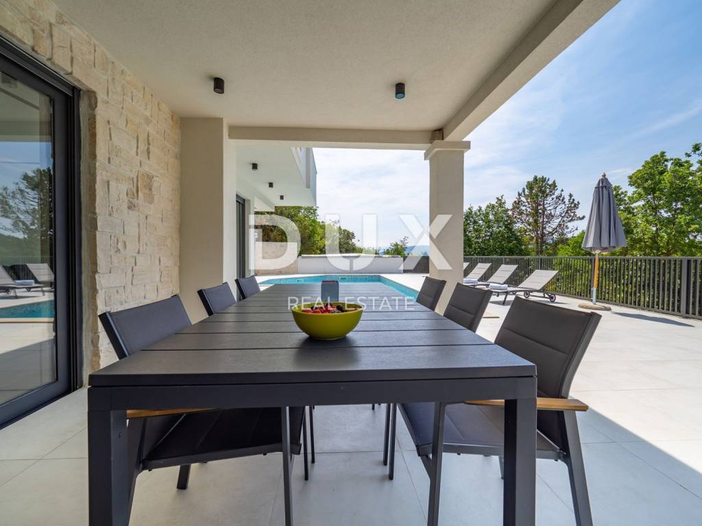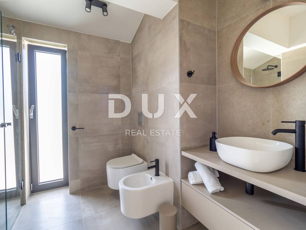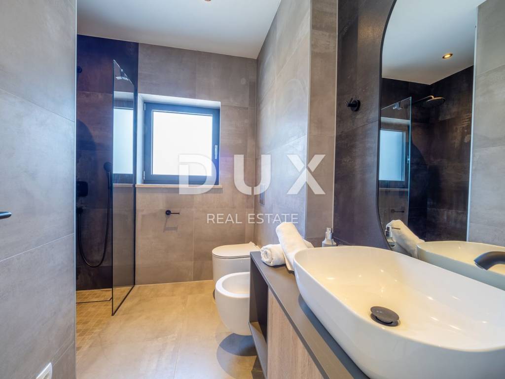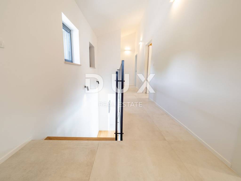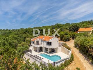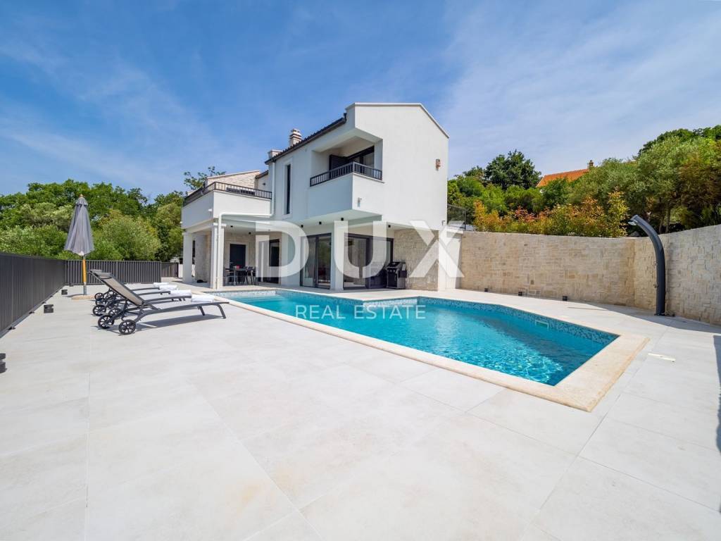 Die Insel Krk, Vrbnik - Luxushaus mit Pool in Meeresnähe Das Haus hat eine Gesamtfläche von 150 m2, erstreckt sich über zwei Etagen, Erdgeschoss und erster Stock, die durch eine Innentreppe miteinander verbunden sind, und befindet sich auf einem Grundstück von 470 m2 . Das Erdgeschoss verfügt über einen überdachten Eingang, Flur, Wohnzimmer mit Küche und Essbereich, Speisekammer, Toilette, Abstellraum, Waschküche, Innentreppe. Das Wohnzimmer öffnet sich auf eine überdachte Terrasse von 30m2 und ein Sonnendeck. In der Speisekammer befindet sich eine Vorbereitung für die Sauna. Im ersten Stock befinden sich drei Schlafzimmer mit eigenem Bad mit Zugang zu einer Terrasse von 15 m2 und einer Loggia von 3 m2 mit Meerblick. Während des Baus wurden hochwertige Materialien und Geräte verwendet, die eine hochwertige Konstruktion garantieren, klimatisiert mit 5 Klimaanlagen, Fußbodenheizung im ersten Stock, Videoüberwachung, WLAN, 2 Schornsteine und Vorbereitung für Außen- und Innenkamin, Aluminiumtischlerei , Sicherheitstüren. Es gibt einen beheizten Swimmingpool im schön angelegten Garten und zwei Parkplätze sind vorhanden. Ruhige Lage, in der Nähe der Grünzone, 500 m vom Meer entfernt.