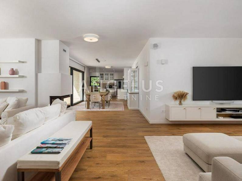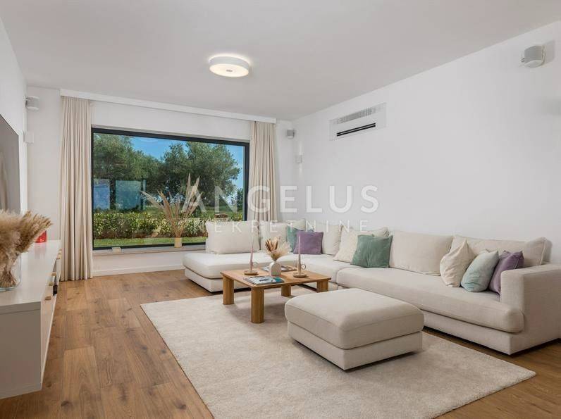 Diese Villa ist in einem modernen Stil mit mediterranen Elementen gestaltet und beeindruckt mit einer lichtdurchfluteten Küche, einem Esszimmer und einem geräumigen Wohnzimmer. Die Inneneinrichtung ist in einem angenehmen mediterranen Stil gehalten und der offene Kamin in der Mitte des Raumes sorgt für eine warme Atmosphäre. Vom Boden bis zur Decke reichende Glasschiebetüren schaffen eine nahtlose Verbindung zur Außenwelt und maximieren das Sonnenlicht.