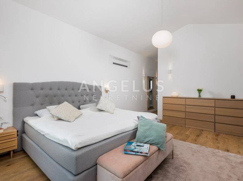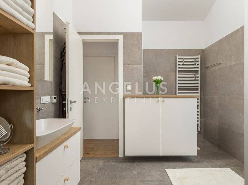 Große Einbauschränke und eine Waschküche im Flur sowie eine barrierefreie Außentreppe, die zu einer riesigen Dachterrasse mit fantastischem Blick auf das türkisfarbene Meer und den angrenzenden Olivenhain führt, unterstreichen einmal mehr die Liebe zum Detail bei der durchdachten Planung des Anwesens. Das Grundstück ist 2534 m groß, wobei sich an zentraler Stelle ein großzügiger Swimmingpool mit einer Fläche von 50 m, einer überdachten Sommerküche und einer angrenzenden Terrasse zum Sonnenbaden oder Grillen befindet.