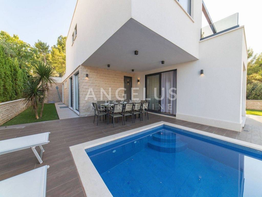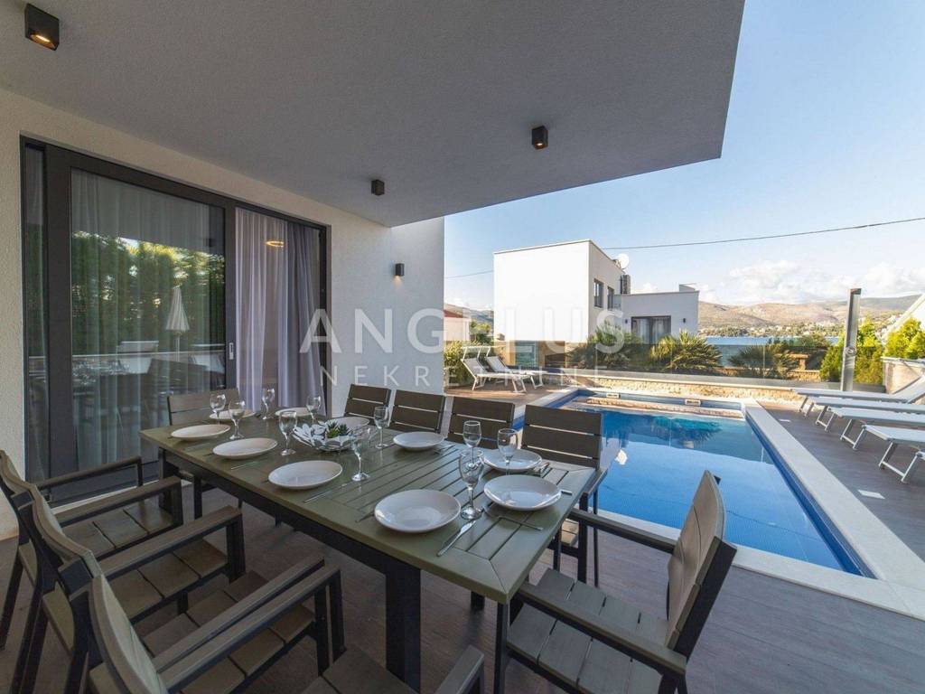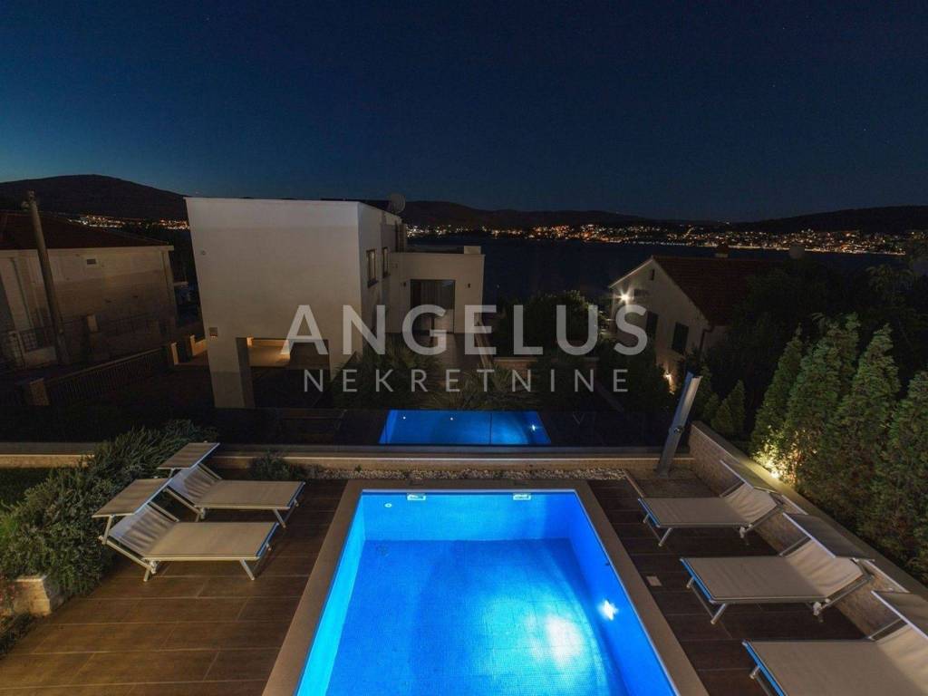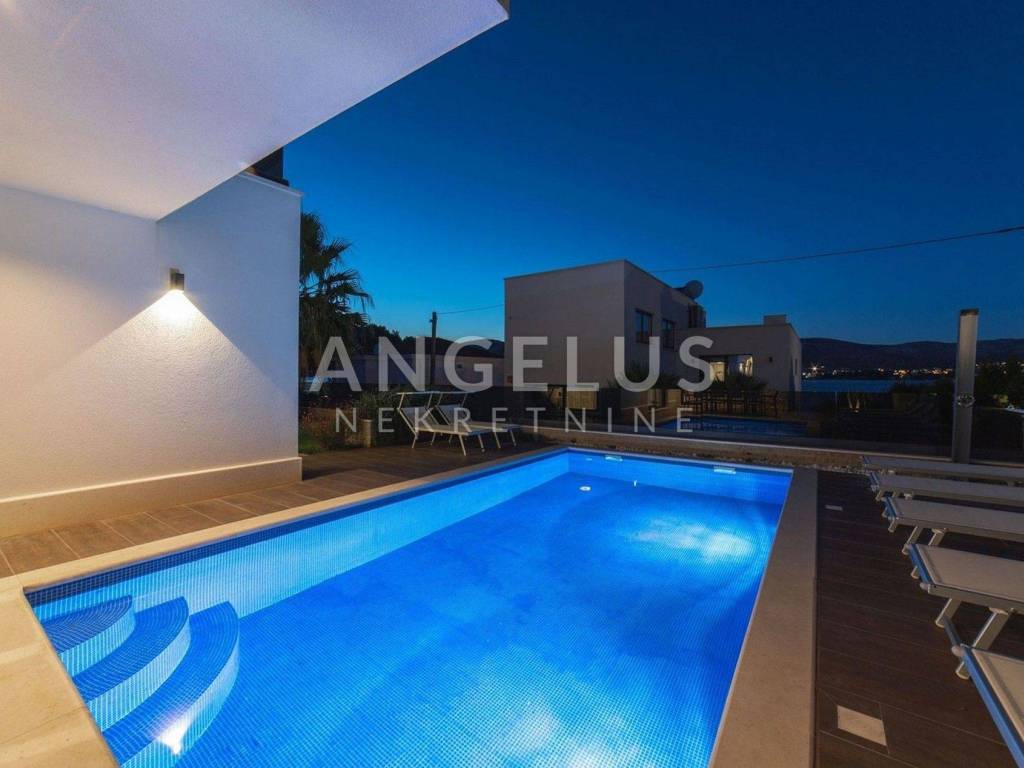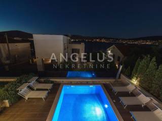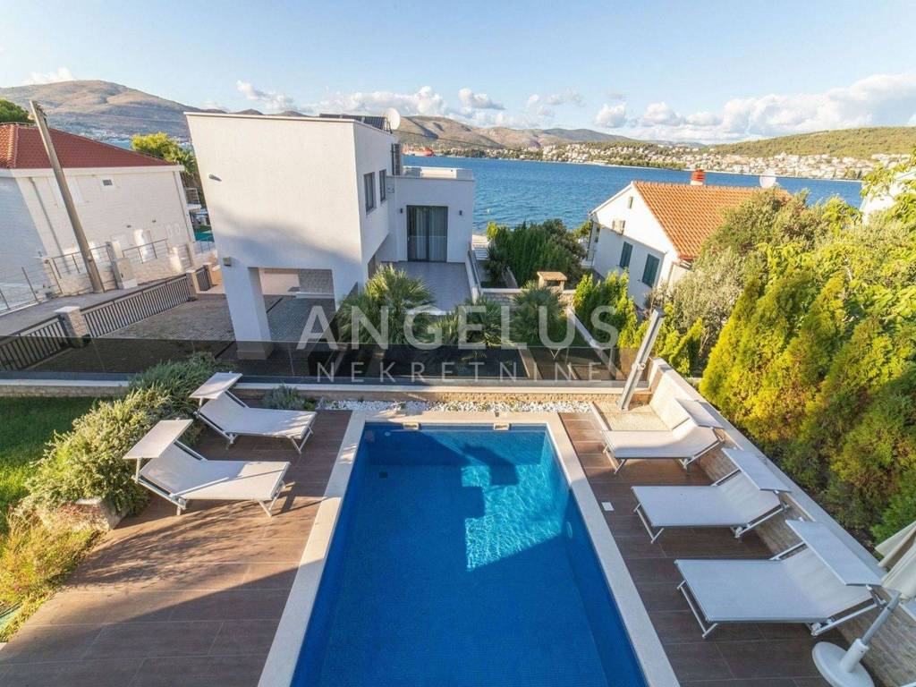 Ein besonderer Teil dieser Villa gehört zur großzügigen Terrasse im Erdgeschoss, die zusätzlich mit einer grünen Rasenfläche, Palmen, Pflanzen und einem schönen Außenpool (35 m) mit Dusche, Liegewiese und Außenkamin geschmückt ist. Die Terrasse bietet einen atemberaubenden Blick auf das Meer, die Berge und die Altstadt von Trogir in der Ferne. Die Gesamtfläche des Gartens beträgt 485 m2.