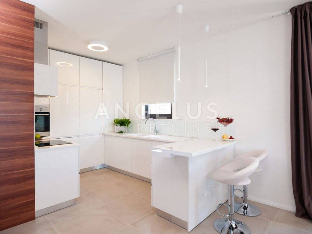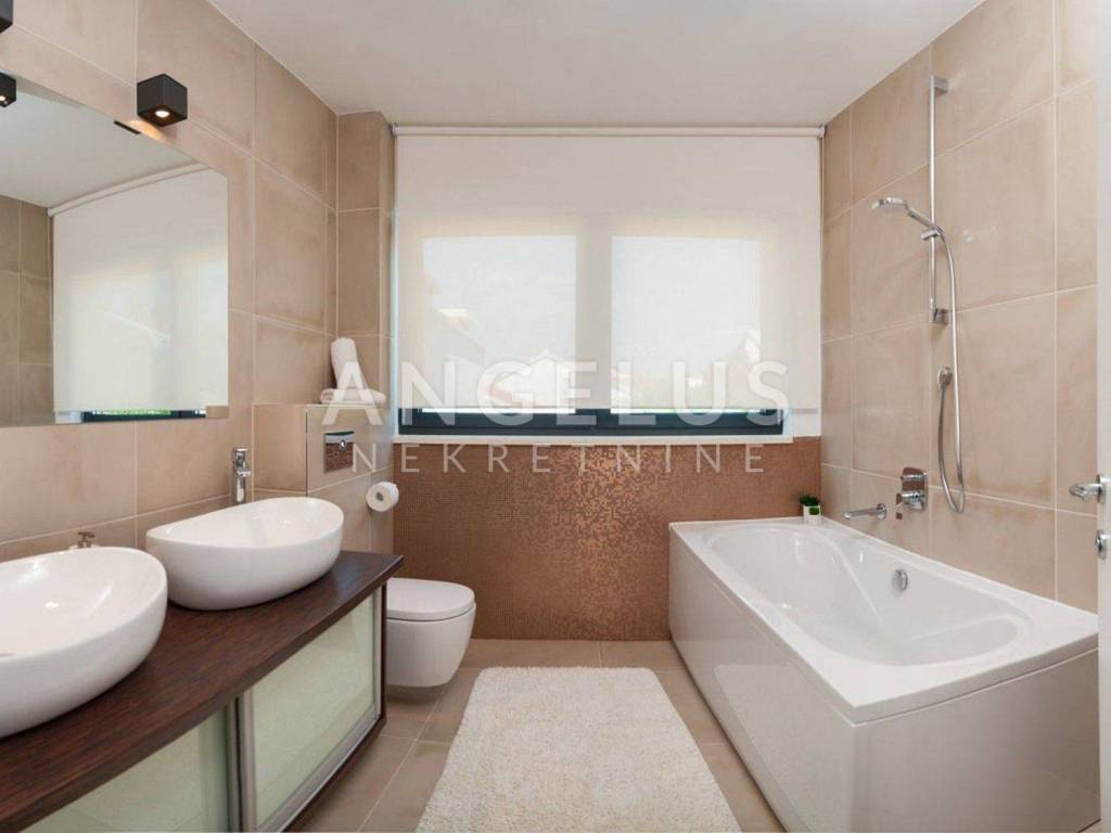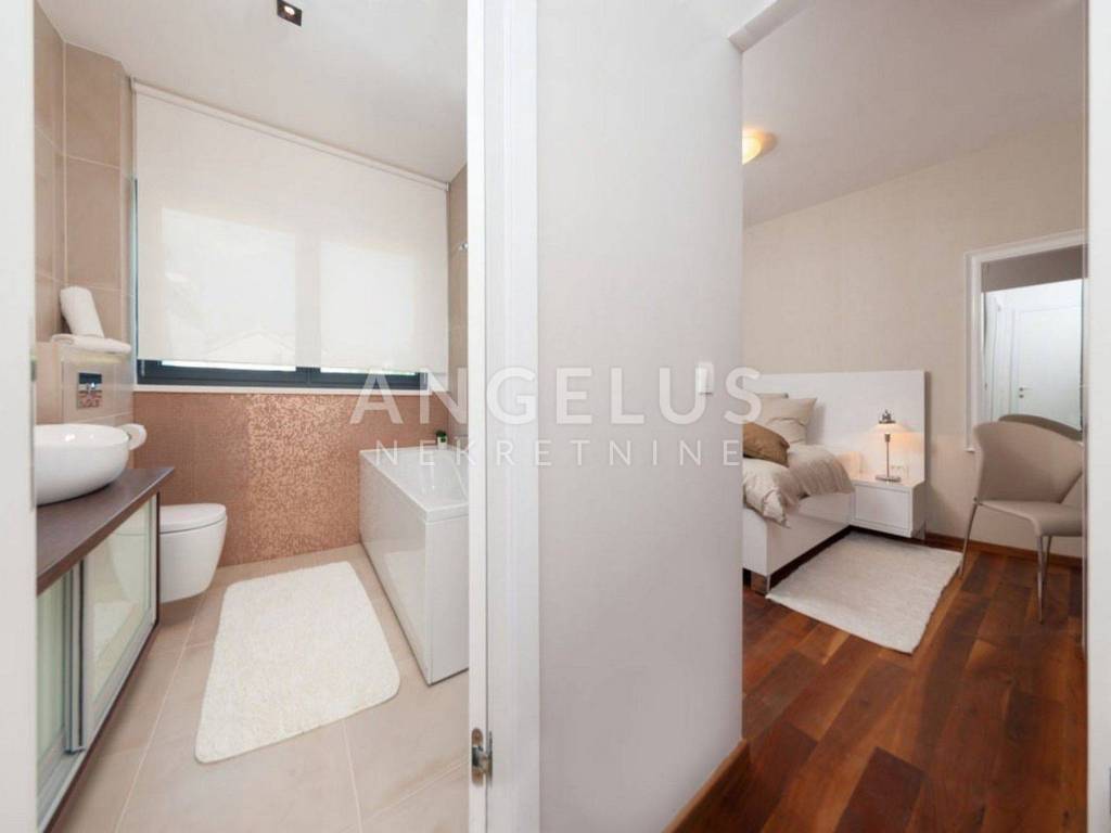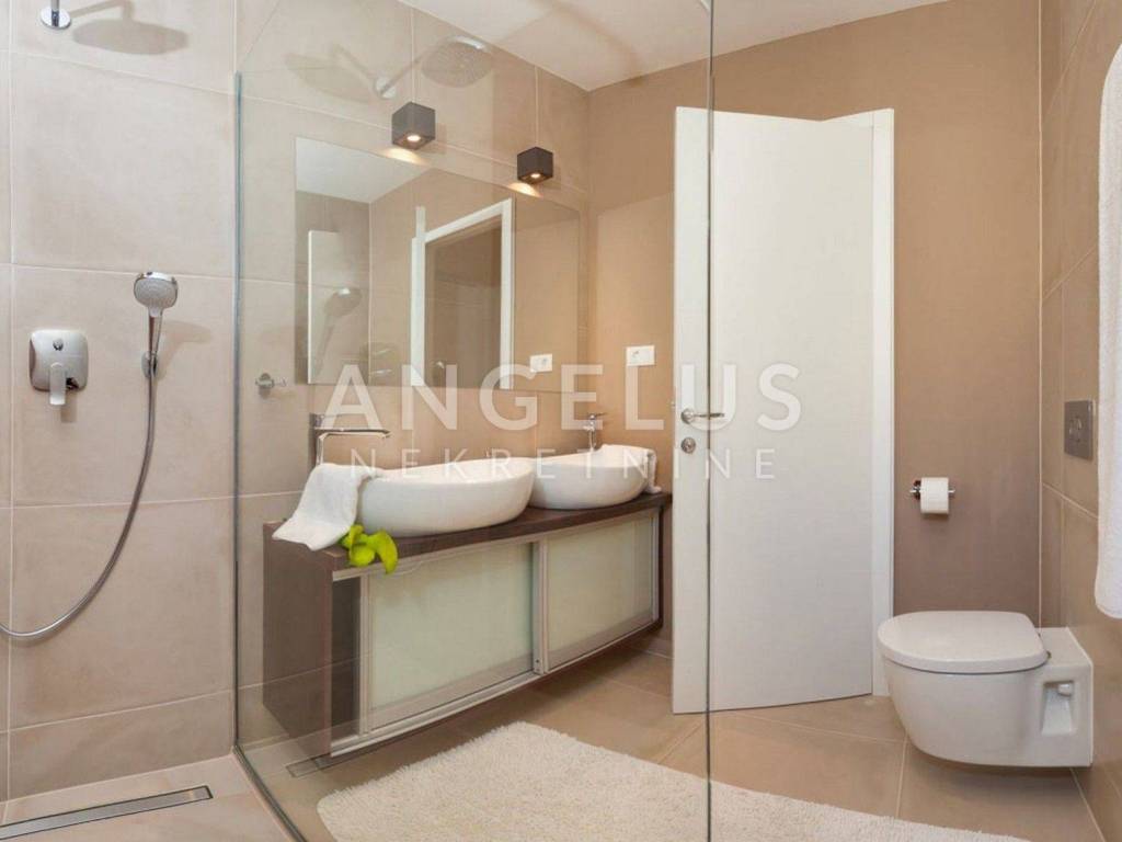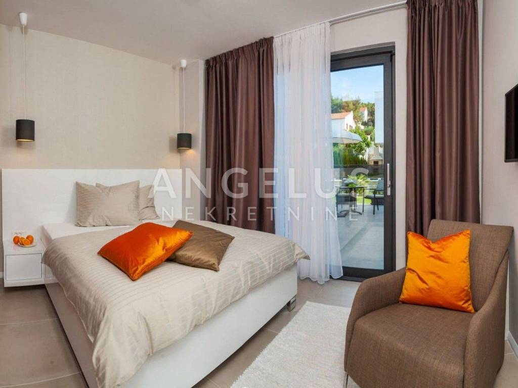 Ein besonderer Teil dieser Villa gehört zur großzügigen Terrasse im Erdgeschoss, die zusätzlich mit einer grünen Rasenfläche, Palmen, Pflanzen und einem schönen Außenpool (35 m) mit Dusche, Liegewiese und Außenkamin geschmückt ist. Die Terrasse bietet einen atemberaubenden Blick auf das Meer, die Berge und die Altstadt von Trogir in der Ferne. Die Gesamtfläche des Gartens beträgt 485 m2.