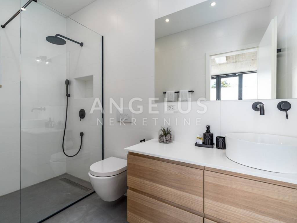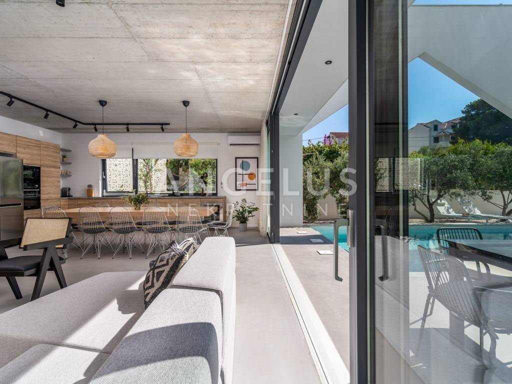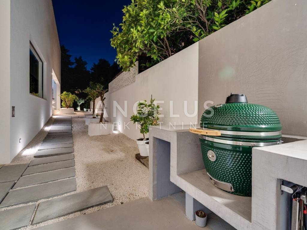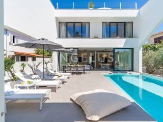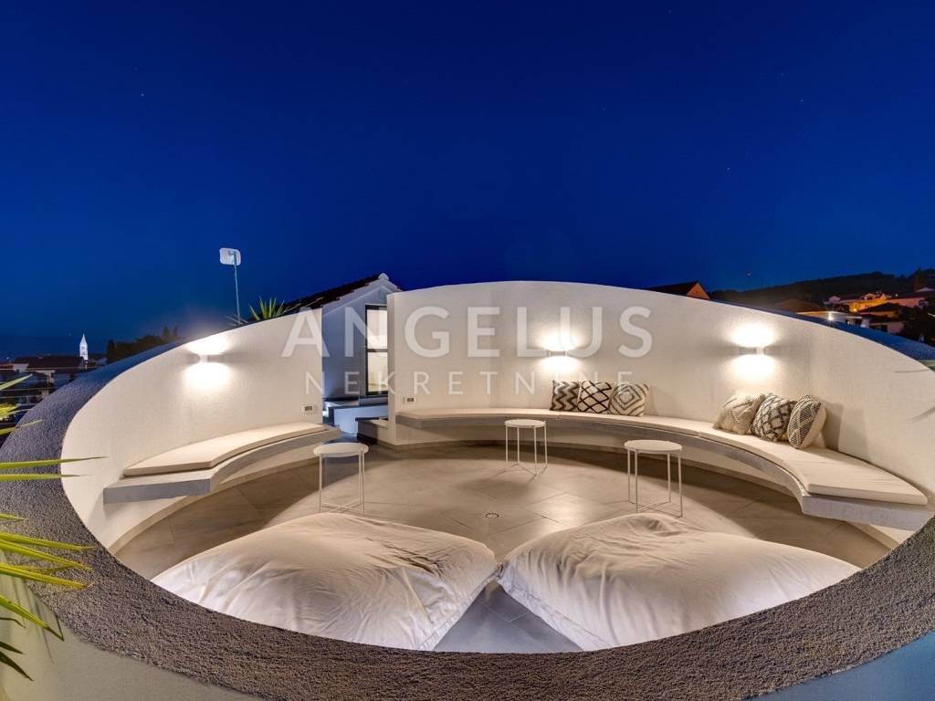 Diese im Jahr 2022 erbaute moderne Luxusvilla erstreckt sich über drei Etagen mit einer Gesamtbruttofläche von 366 m2 und liegt auf einem attraktiven Grundstück von 488 m2, dessen Dachterrasse einen herrlichen Blick auf die Altstadt und das Meer bietet . Die charmante und unwiderstehliche Immobilie strahlt eine harmonisch nuancierte Portion Schönheit und Design aus, wobei beim Bau auf die nötige Privatsphäre und den nötigen Komfort geachtet wurde, wie die detaillierte Planung und Ausführung des Innen- und Gartenbereichs beweist. Die gesamte Nettofläche der Villa beträgt 240 m2 und besteht aus einer offenen Küche, einem Esszimmer und einem geräumigen Wohnzimmer, die sich im Erdgeschoss der Villa befinden und durch die großen, durchgehenden Glaswände perfekt mit der Villa verbunden sind Aussen Pool. Das gesamte Erdgeschoss verfügt über Fußbodenheizung und ist mit modernster Technik und Geräten ausgestattet: Flachbildfernseher, Surround-Sound-System, WLAN. Hinter dem Wohnzimmer gelangt man über mehrere Außentreppen in den Raum mit finnischer Sauna und Dusche. Nebenan befindet sich ein Waschraum mit Waschmaschine und Trockner. Im Zwischengeschoss (Mezzanine) der Villa befinden sich zwei identische Schlafzimmer mit eigenem Bad und Dusche, während im ersten Stock auch zwei große Räume mit Kochnische und Dusche sowie eine Terrasse vorhanden sind. Im zweiten Stock gibt es ein Hauptschlafzimmer mit freistehender Badewanne, ein eigenes Badezimmer mit Dusche und eine Terrasse. Auf der Dachaußenterrasse befindet sich ein umzäuntes Wohnzimmer mit runder Form zum Entspannen mit Blick auf das Meer. Auf dieser Ebene gibt es auch ein voll ausgestattetes Homeoffice (im Dachgeschoss).