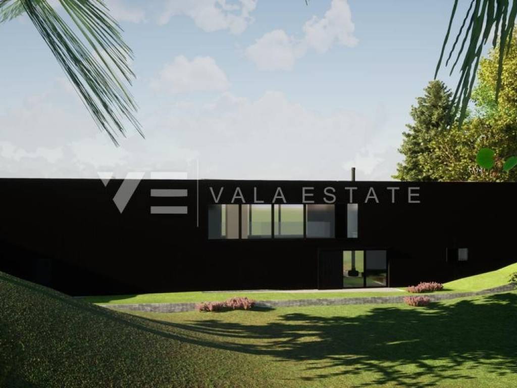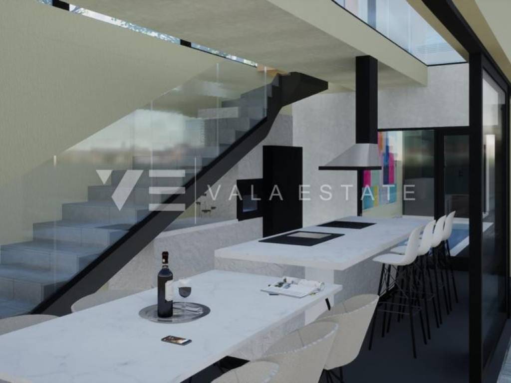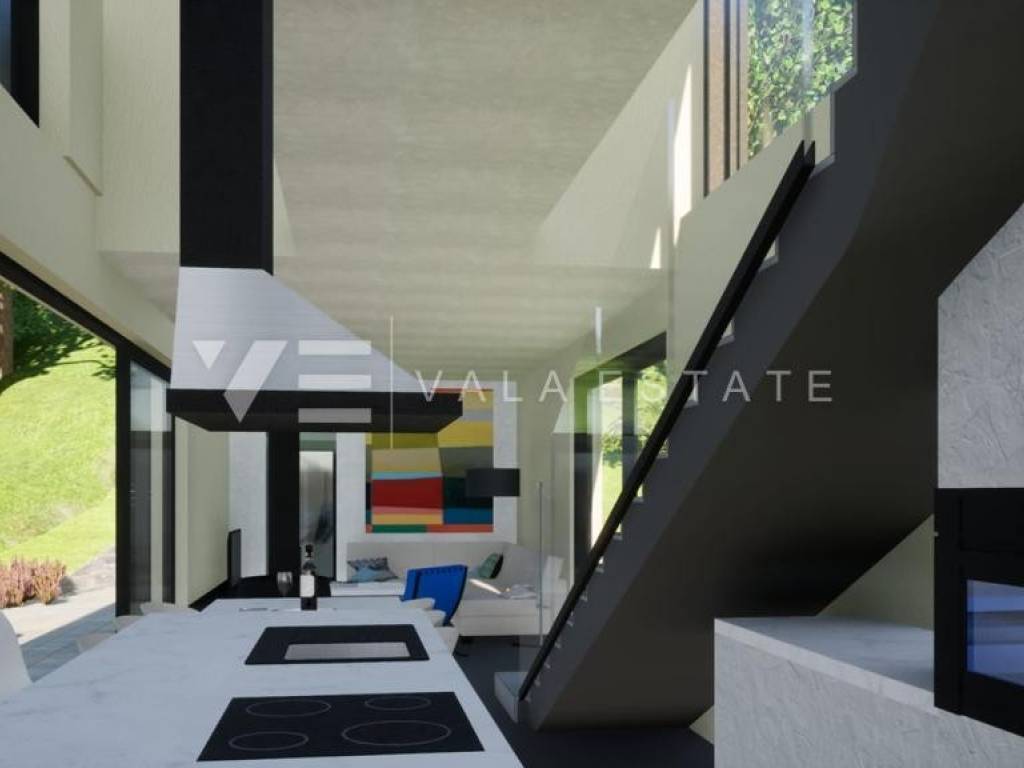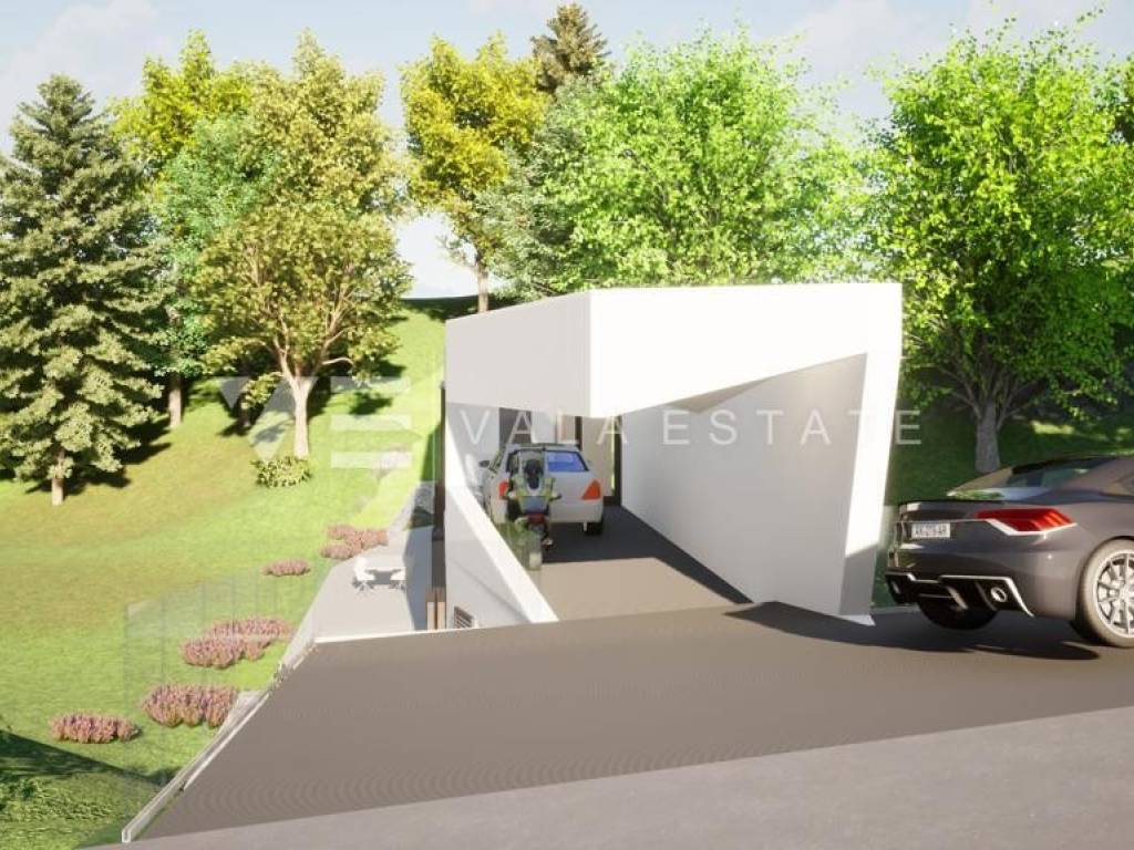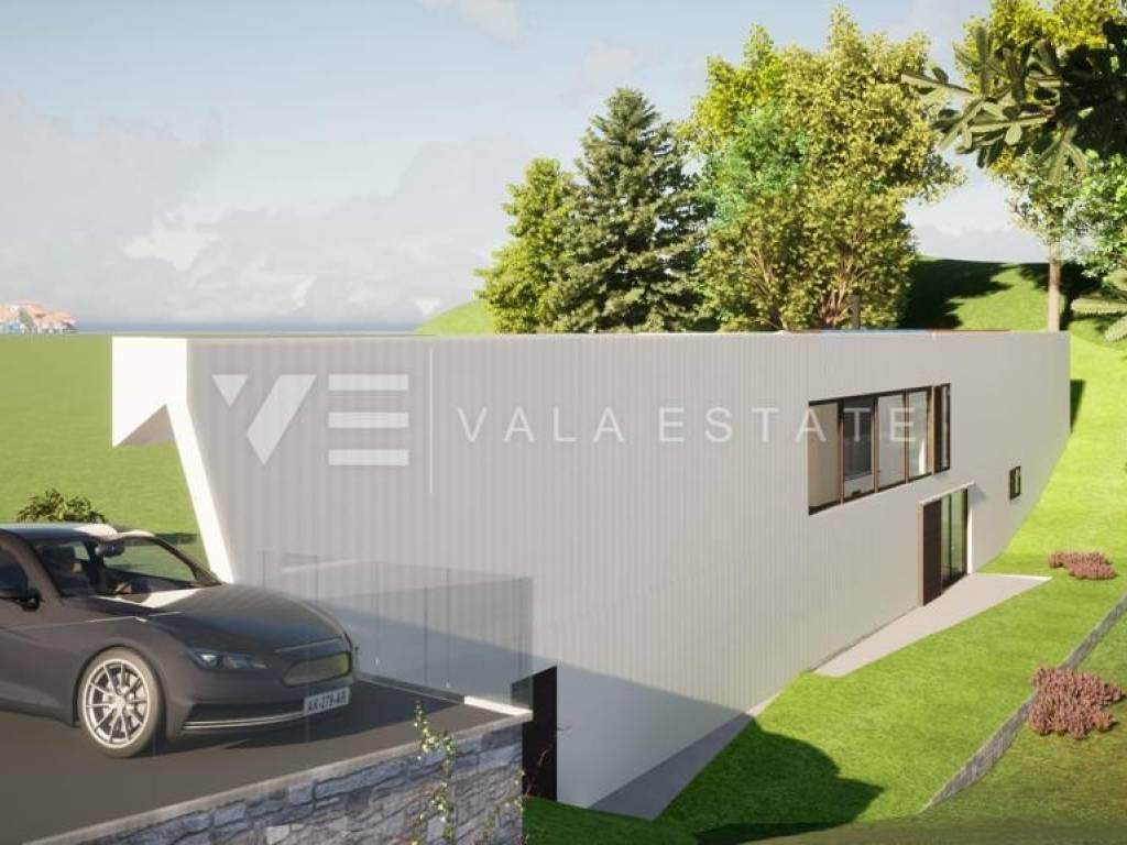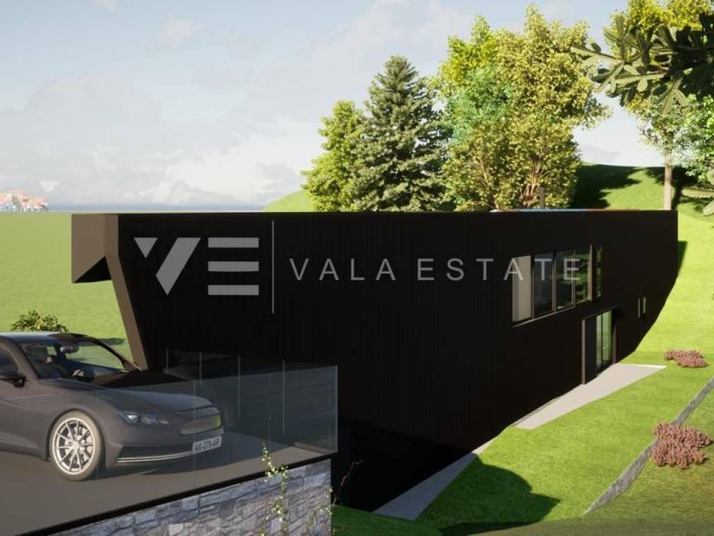 Immobilieninsel Krk, Vrbnik zum Verkauf steht ein Baugrundstück mit einer Gesamtfläche von 646 m2 mit einem konzeptionellen Projekt für den Bau einer modernen Villa mit Innenpool. Die Villa ist in ein Erdgeschoss und ein Obergeschoss mit einer Gesamtwohnfläche von 210 m2 aufgeteilt. Im Erdgeschoss befinden sich ein Maschinenraum, eine Toilette, ein Innenpool, ein Schlafzimmer, ein Badezimmer, eine Küche und ein Esszimmer sowie ein Wohnzimmer mit Zugang zu einer überdachten Terrasse. Auf der Etage, die über eine Innentreppe oder einen Aufzug erreichbar ist, befinden sich eine überdachte Eingangshalle mit Parkplatz, ein Eingangsbereich, ein Badezimmer und ein Schlafzimmer mit Zugang zu einer überdachten Terrasse. Die Lage ist ruhig, in der Nähe schöner Strände und des Zentrums mit allen Einrichtungen.