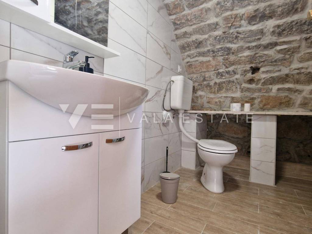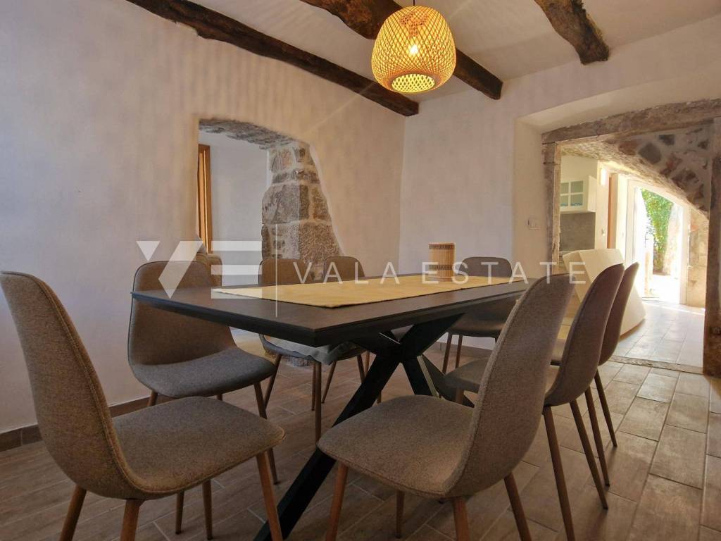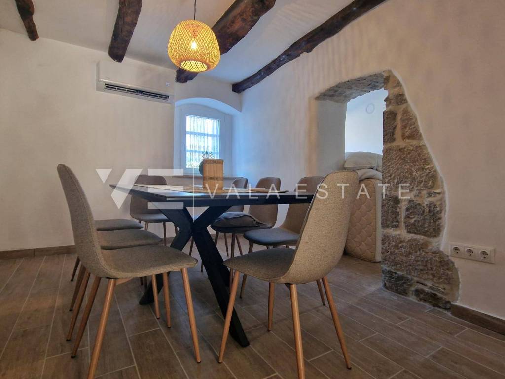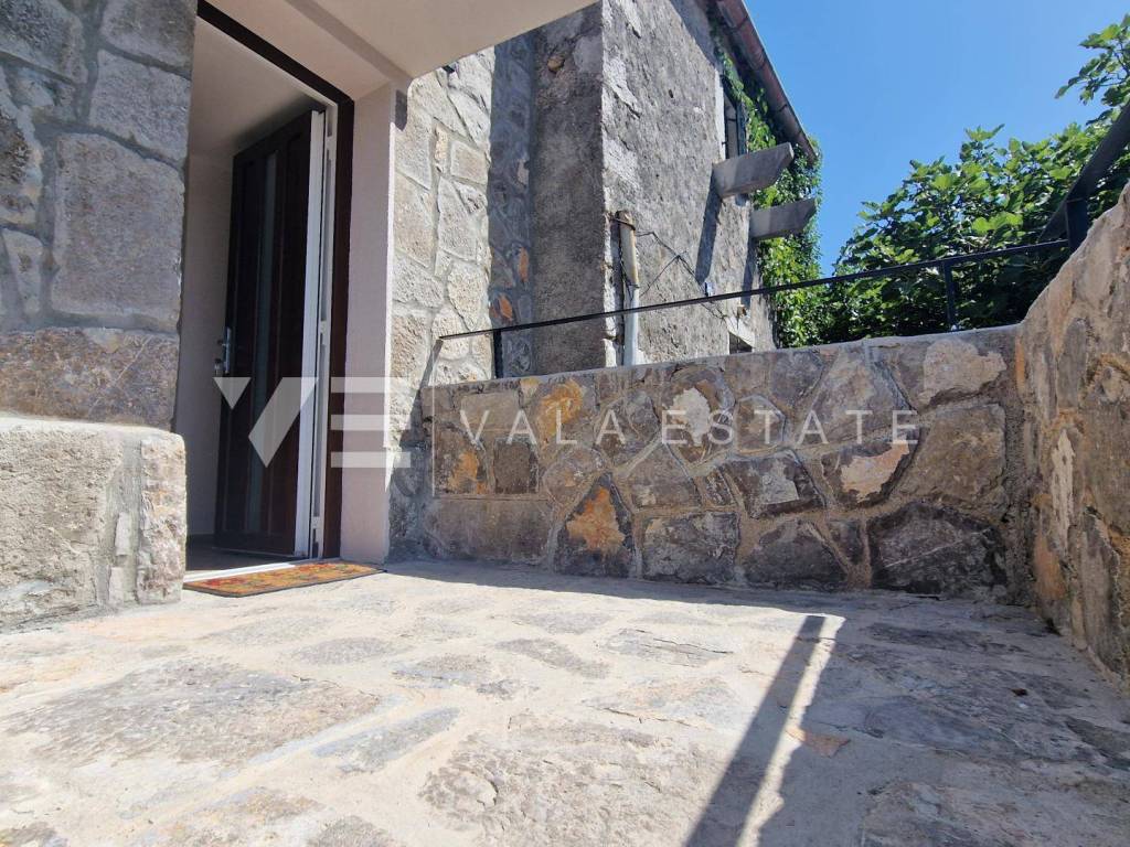 Immobilien Insel Krk, Umgebung der Stadt Krk renoviertes Steinhaus zum Verkauf in Reihe mit zwei Wohnungen verteilt auf 200 m2. Im Erdgeschoss befindet sich eine 60 m2 große Wohnung mit einem Badezimmer, einem Schlafzimmer und einem Wohnzimmer mit Küche und Esszimmer. Im ersten und zweiten Stock befindet sich eine geräumige zweistöckige Wohnung von 140 m2, die einen Eingangsbereich, ein Badezimmer, vier Schlafzimmer, eine Küche mit Esszimmer und ein Wohnzimmer mit Ausgang zur Terrasse umfasst. Beide Einheiten sind durch eine Außentreppe verbunden. Es gibt drei Parkplätze im Garten. Bei der Renovierung wurden einheimische Elemente und Stein beibehalten, hochwertige Baumaterialien verwendet, das Haus ist klimatisiert und verfügt über PVC-Außenschreinerei. Es befindet sich derzeit in der Renovierungsphase und die Fertigstellung der Arbeiten ist für Ende 2023 geplant. Die Lage ist wunderschön und ruhig, 2000 m vom Meer und schönen Stränden entfernt.