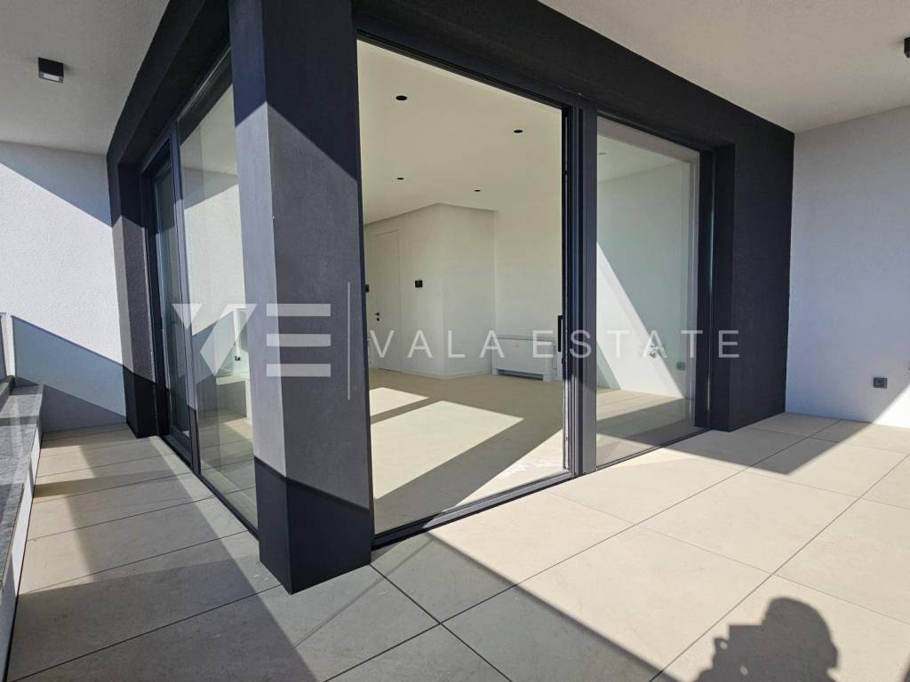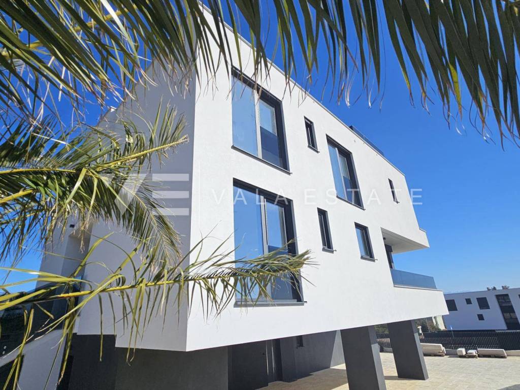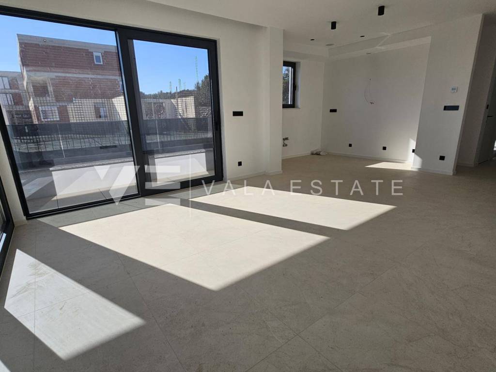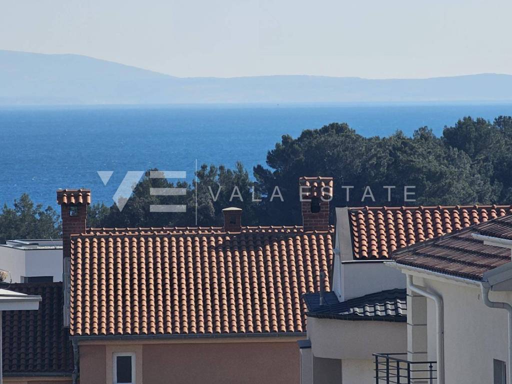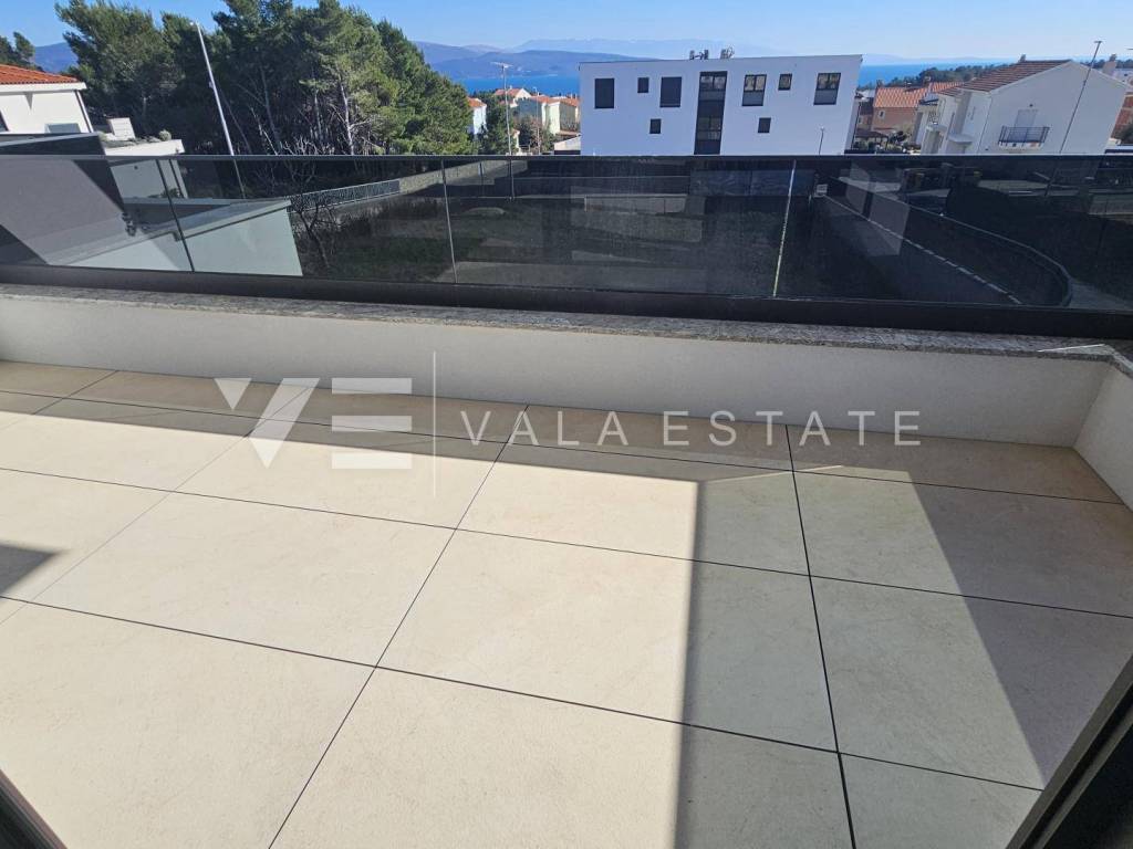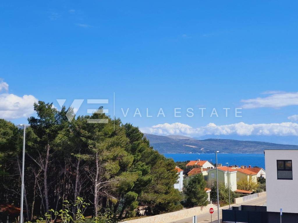 Immobilien Insel Krk, Krk - zum Verkauf steht eine Luxuswohnung im ersten Stock eines Familienhauses mit insgesamt vier Wohneinheiten. Die Wohnungsfläche von 73.75 m2 verteilt sich auf Eingangshalle, Speisekammer, Schlafzimmer, Bad, Küche mit Wohnzimmer und große Terrasse von 15,23 m2. Die Wohnung verfügt über einen Abstellraum von 5,62 m2 und zwei Parkplätze. Top-Bauweise und -Ausstattung mit Materialauswahl, Fußbodenheizung mit Wärmepumpe, ALU-Tischlerei und Klimaanlage aller Räume. Es befindet sich in ruhiger Lage, 600 m vom Meer und schönen Stränden und etwa 800 m vom Zentrum und allen Annehmlichkeiten entfernt.